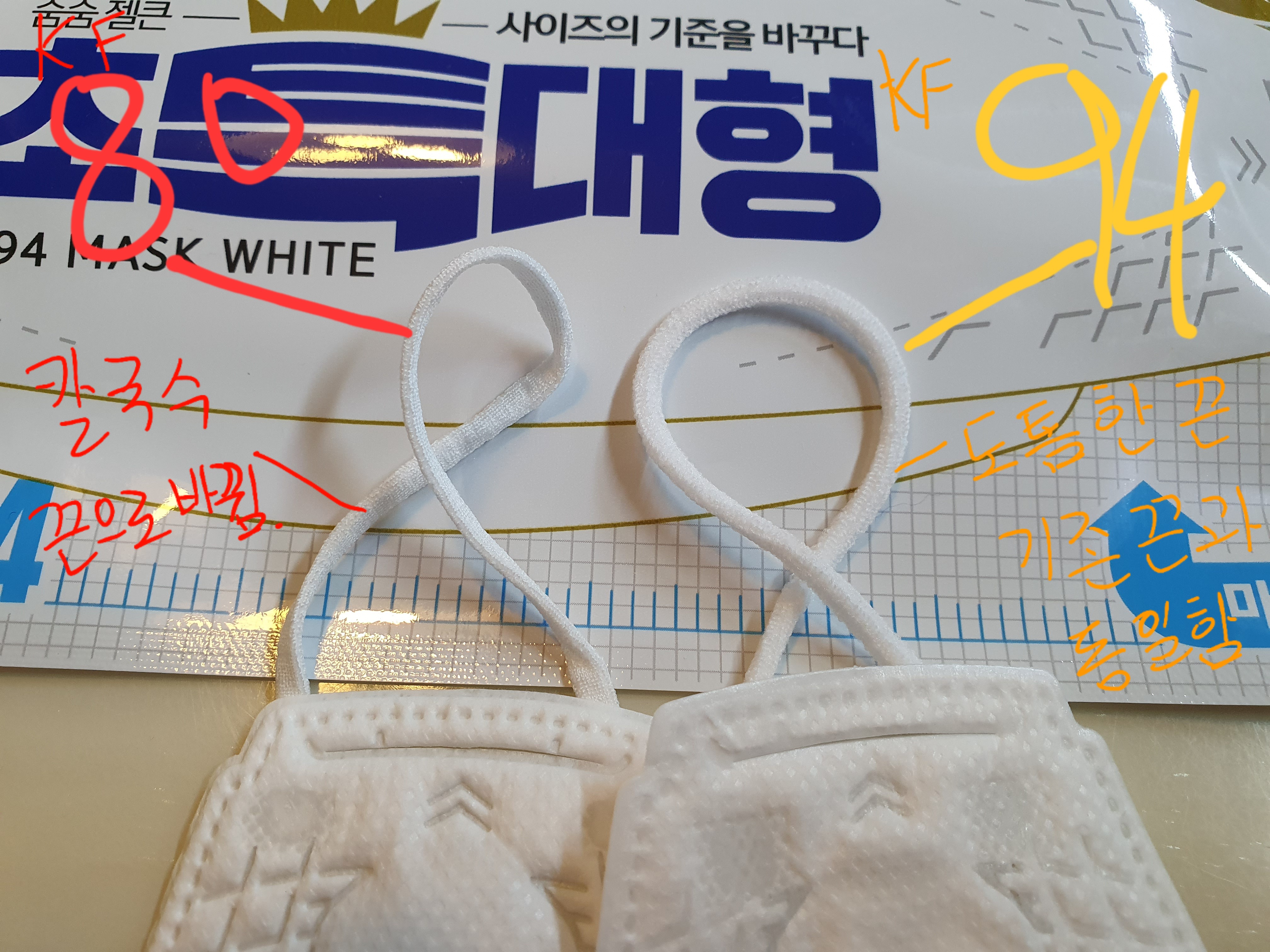 KF80은 끈이 칼국수처럼 얇은 스탈이고, KF94의 경우 일반적인 엠보싱 처리된 마스크 끈입니다.