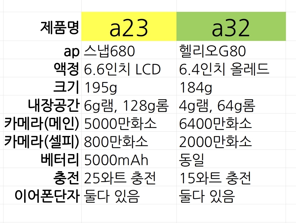 | 갤럭시 a23 | 갤럭시 a32 | |