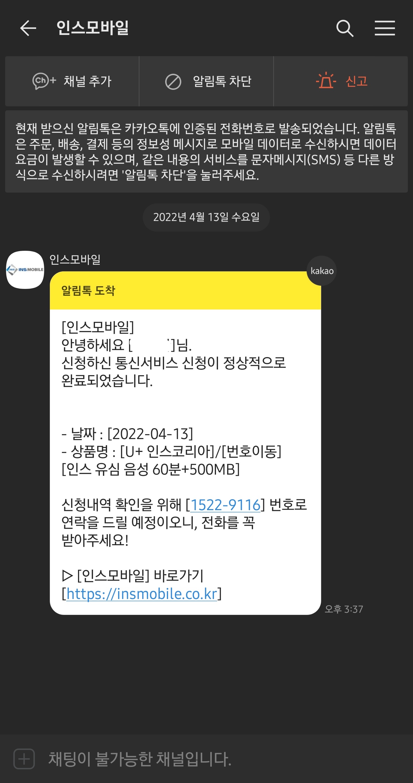 제가 선택한 알뜰폰 통신사는 "인스모바일"이라는 업체입니다.
