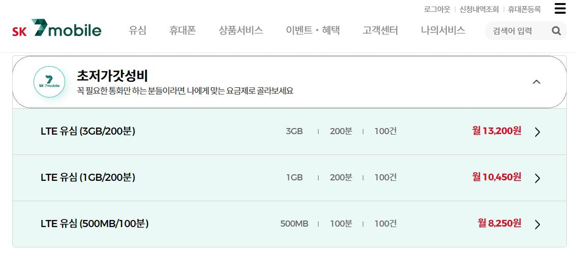 이젠 LTE유심(1GB/200분)으로 바뀌고 월이용요금이 10,450원으로 바뀌었습니다.
