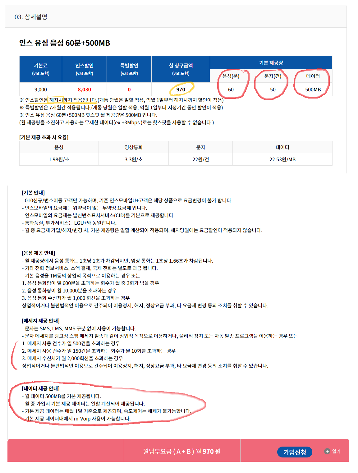 가성비 요금제인 "인스 유심 음성 60분+500MB" 이란 요금제 입니다.