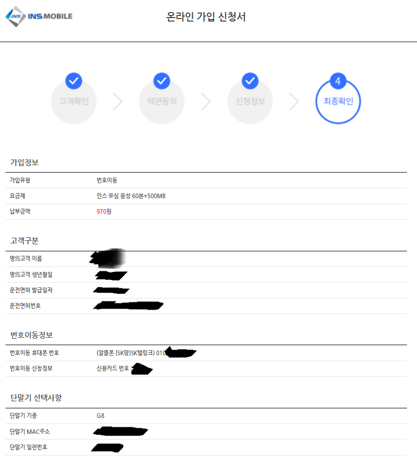 *인스모바일 970원 요금제 유심 신청하기