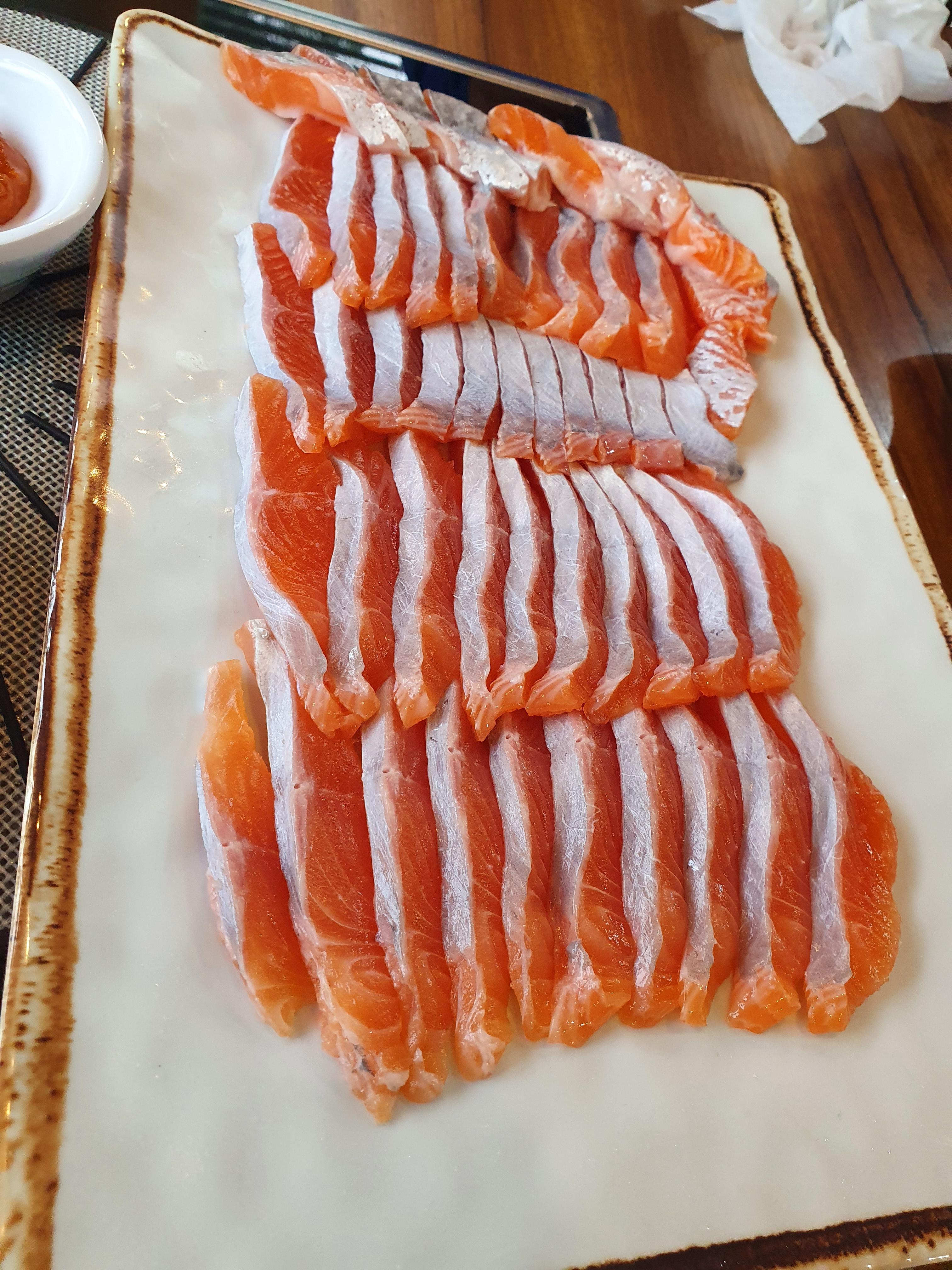 그럼 맛이게 만든 송어회를 한번 먹어 보겠습니다.