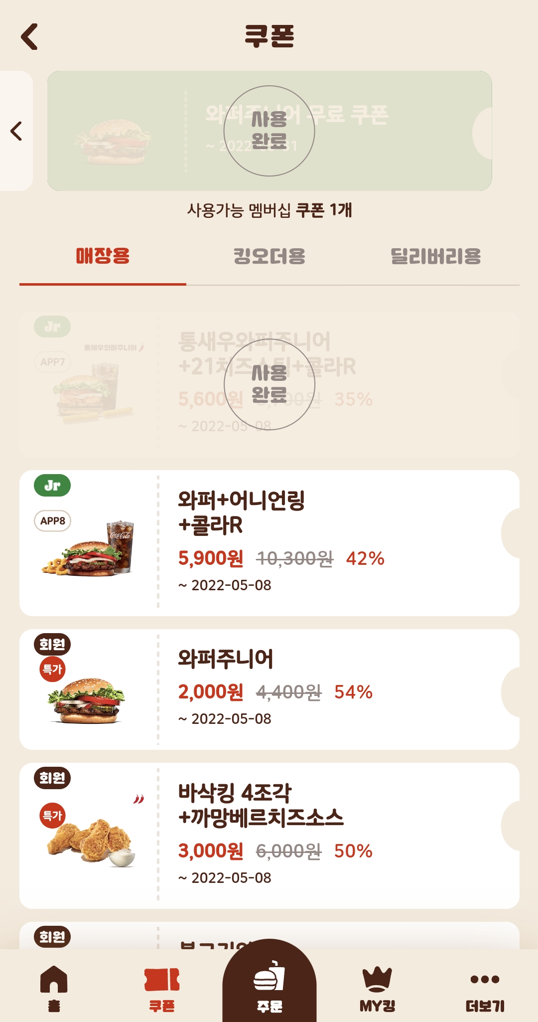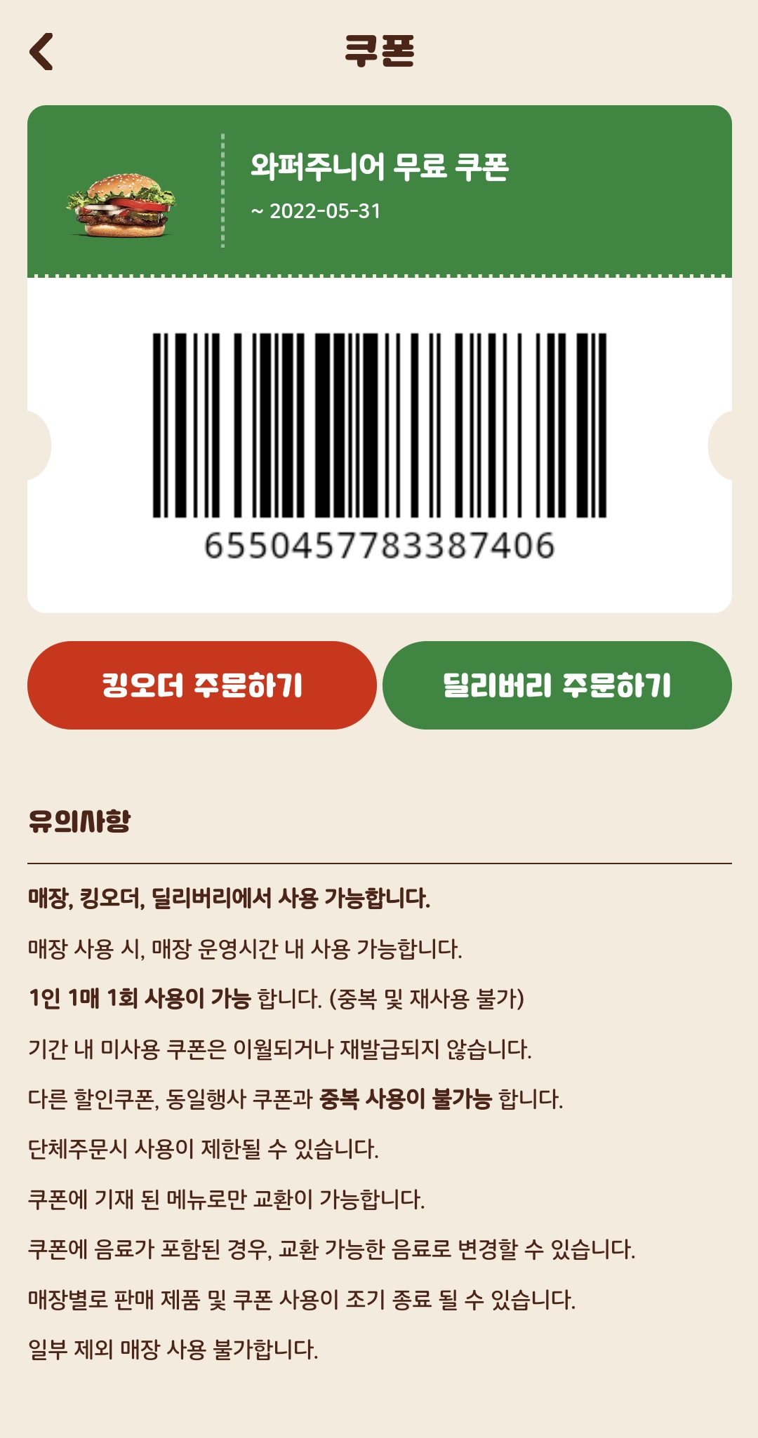 그리고 주문이 끝나고 와퍼주니어 무료 쿠폰을 또 사용하였습니다.