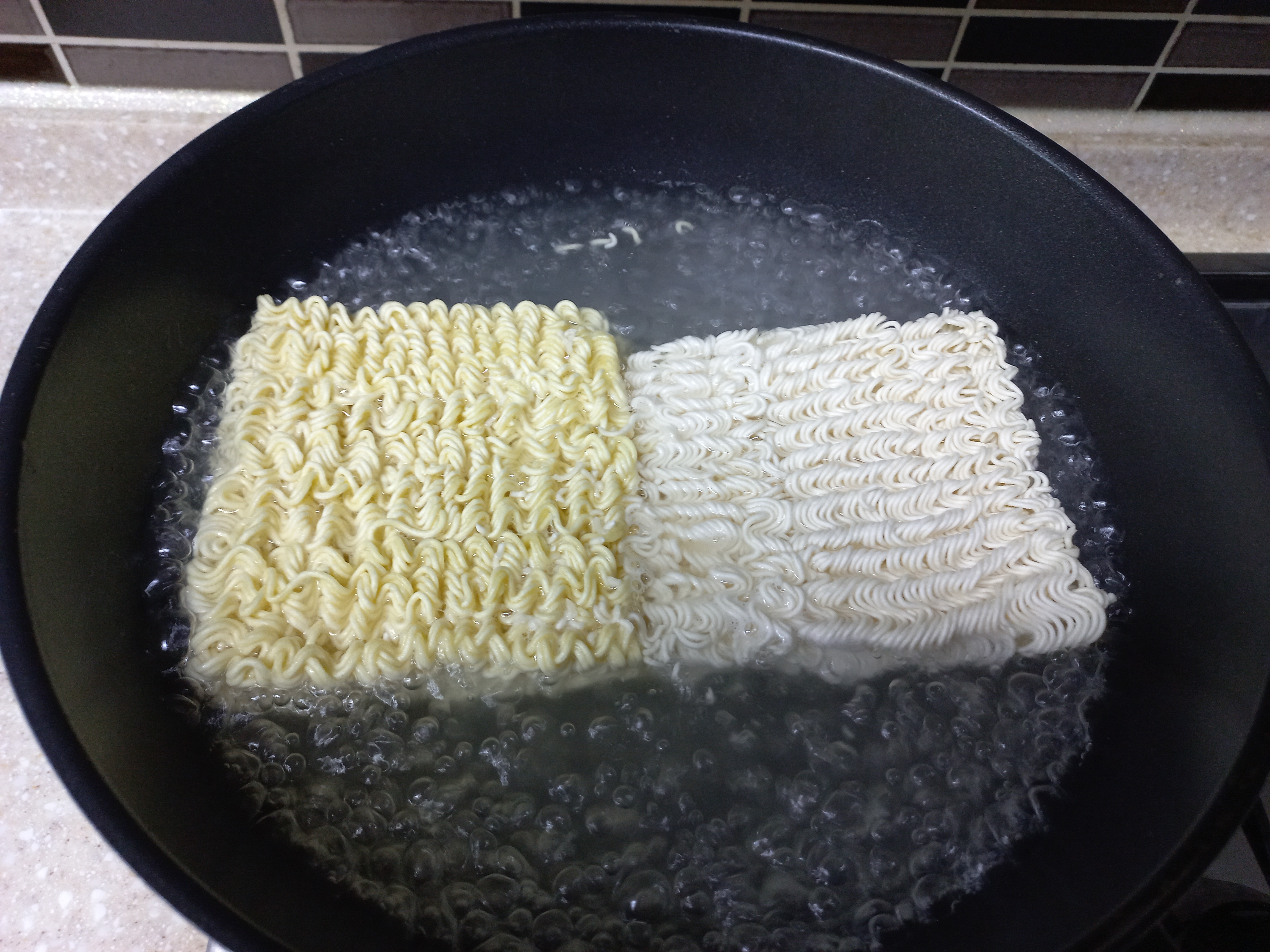 두개의 라면이 섞이니 하얀색과 노란색이 조화롭습니다.