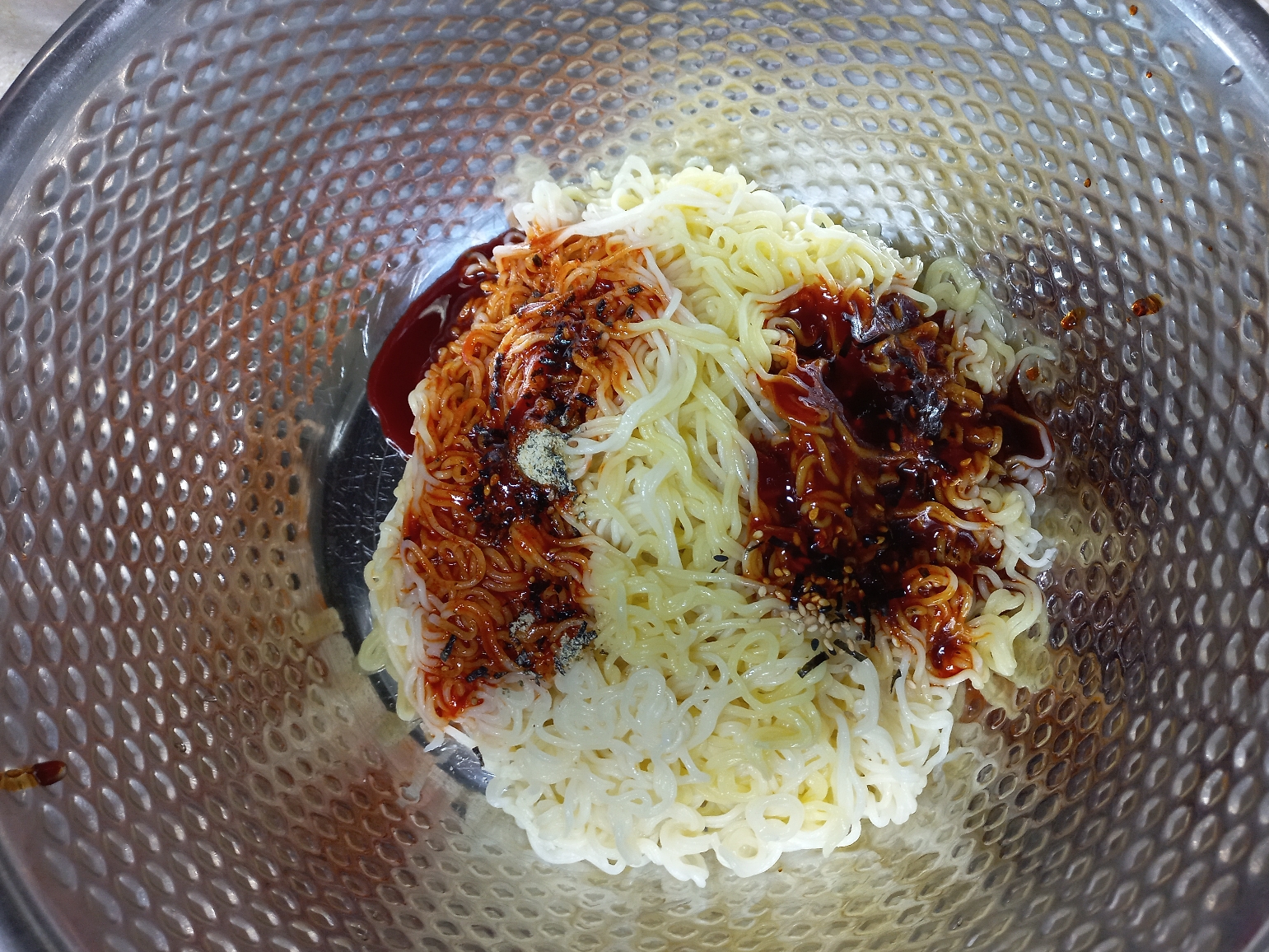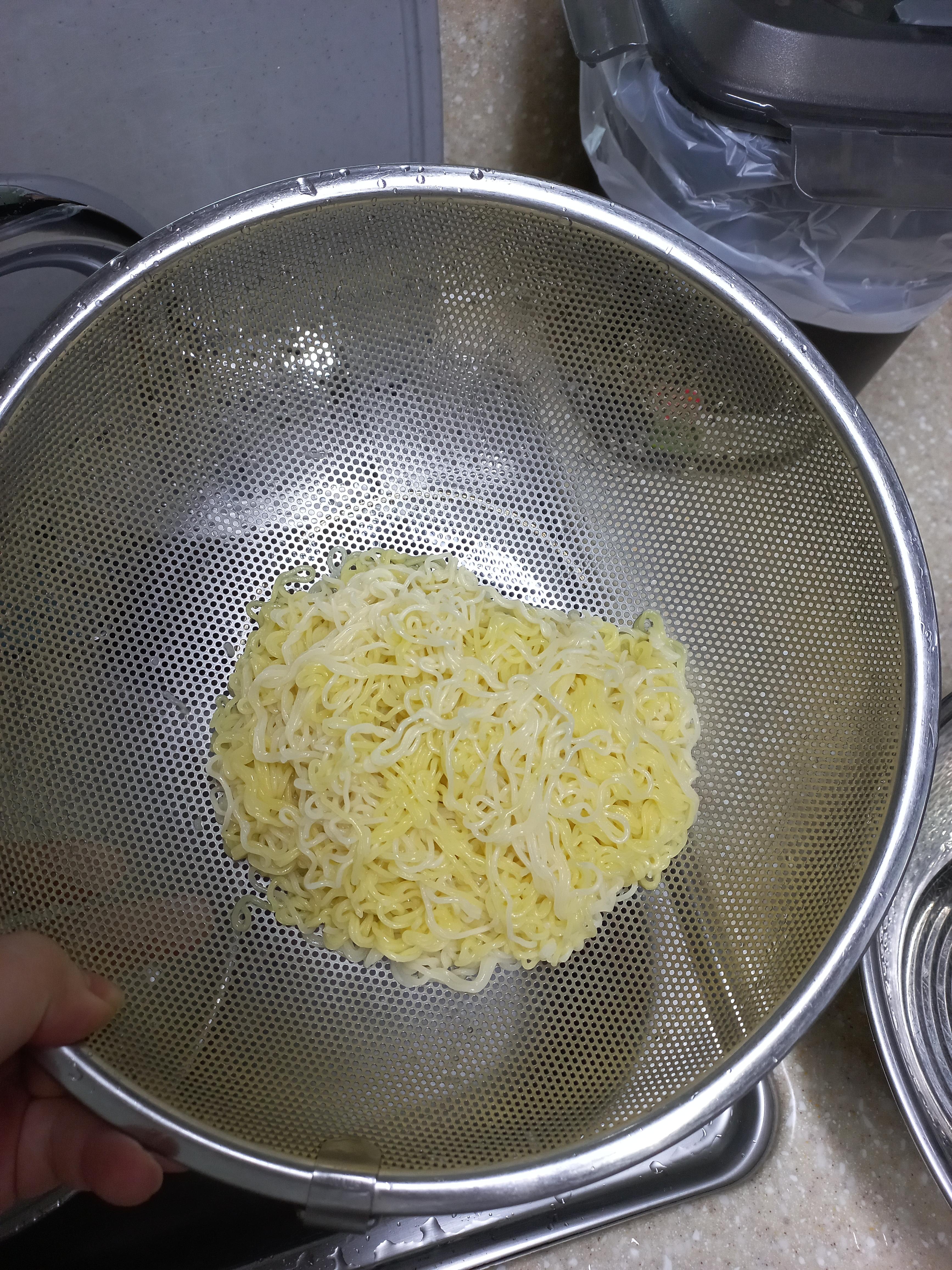 채에 받아서 물을 빼고, 면을 조금 눌러서 면에 있는 물기를 쪼금 빼줍니다.