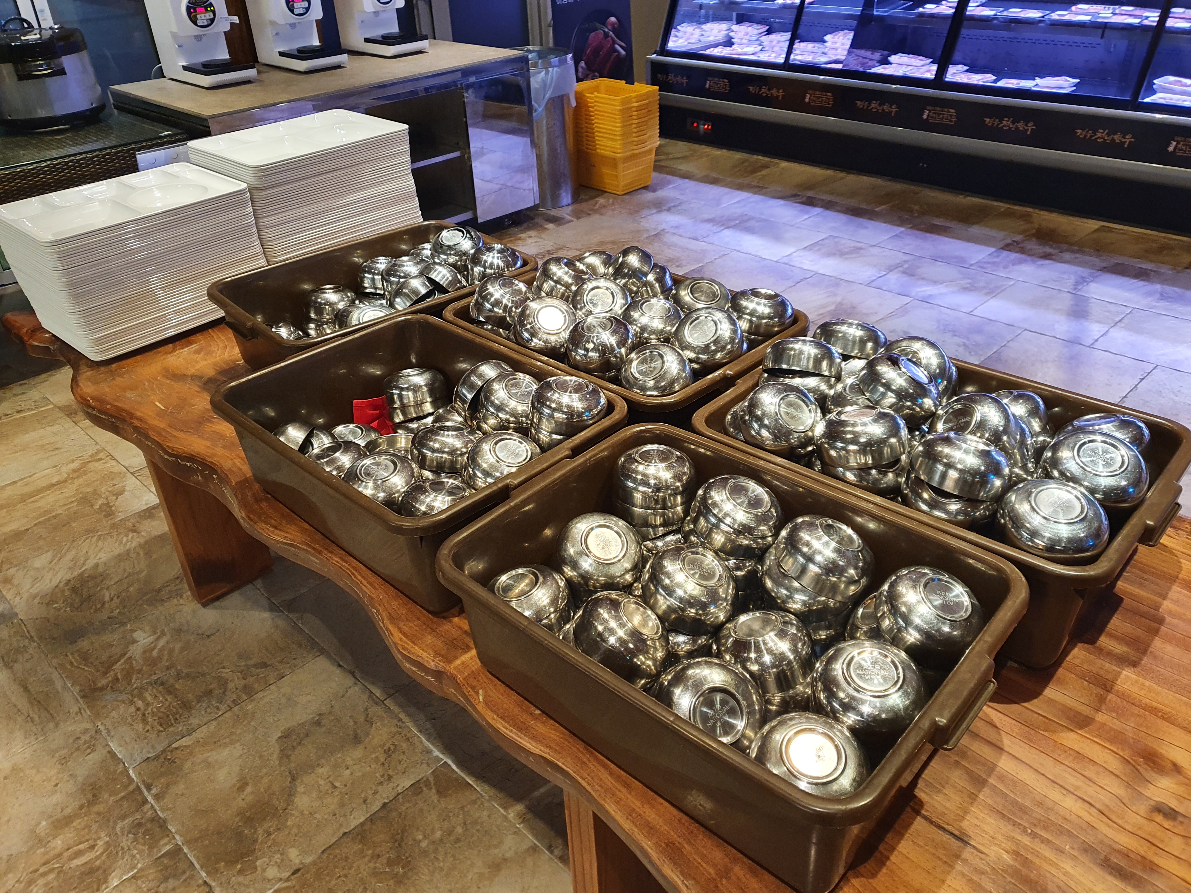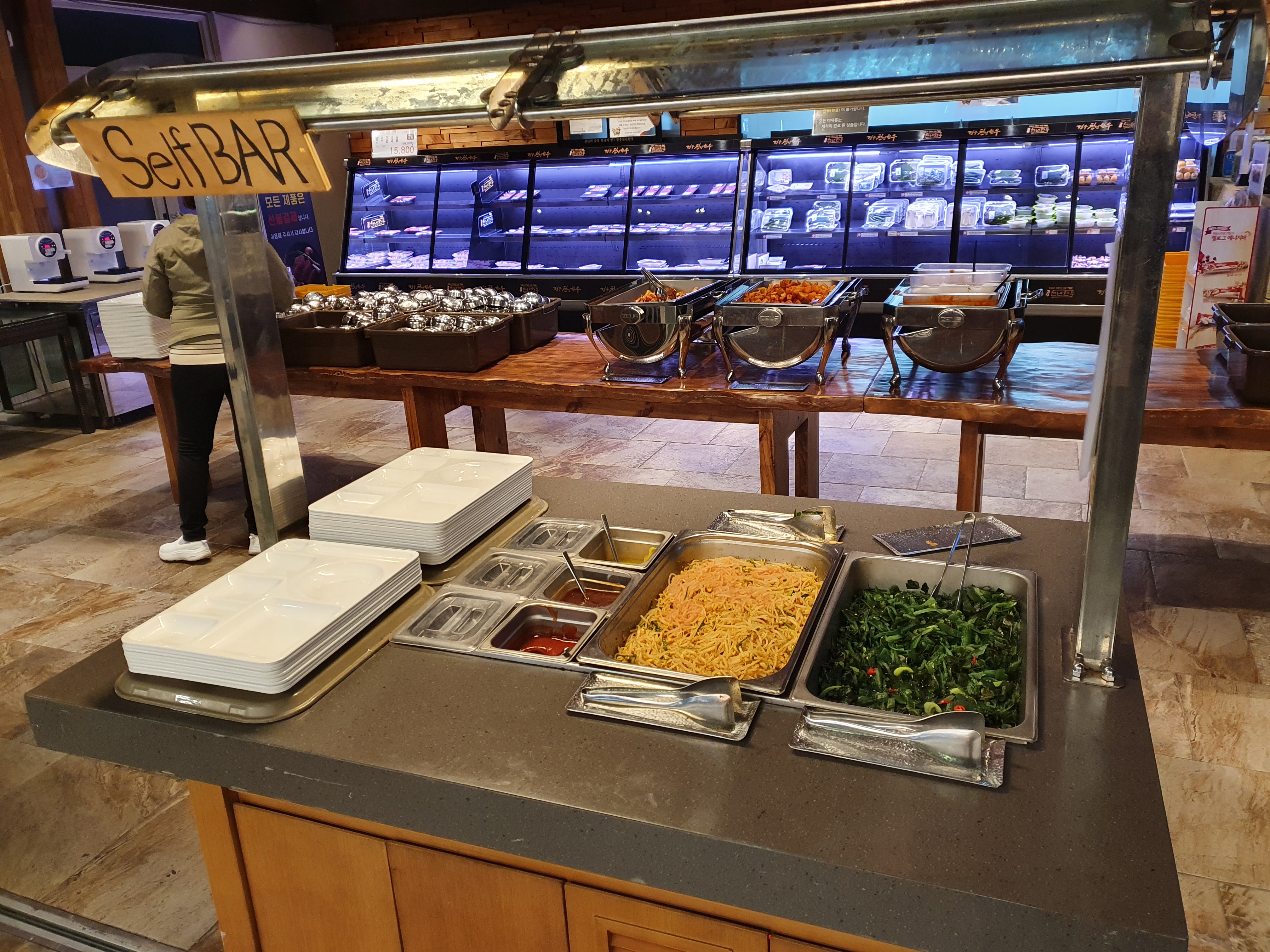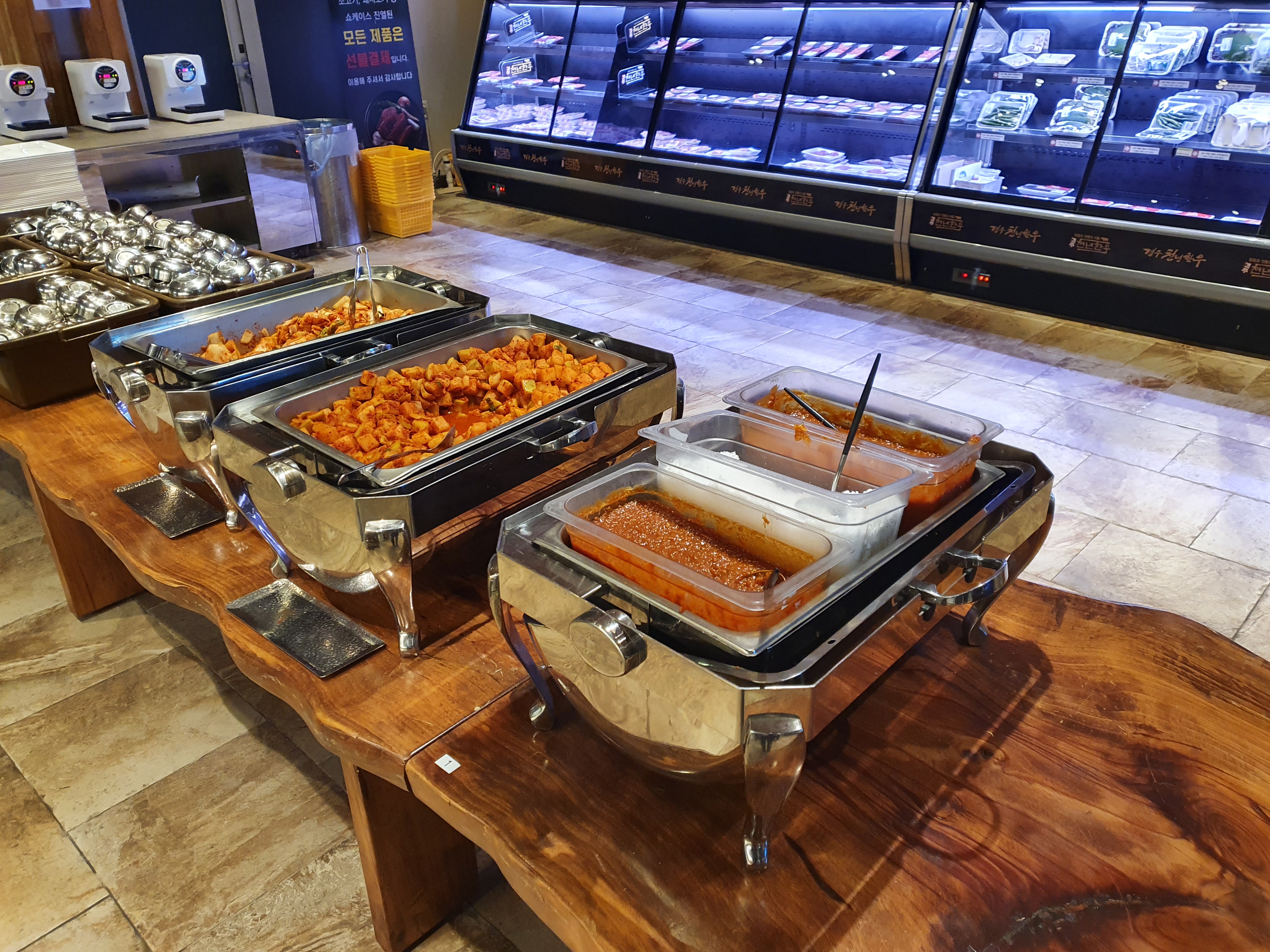 고기와 샐러드바는 같은 공간에 있습니다.