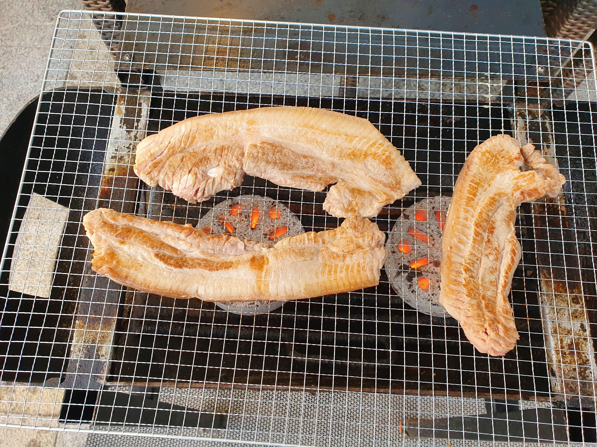 원래는 모닥불에 구워 먹는 건데 바람 때문에 연기가 너무 심하게 나서 그냥 고기 구워 먹는 연탄불에 다 올려놓고 구웠습니다.