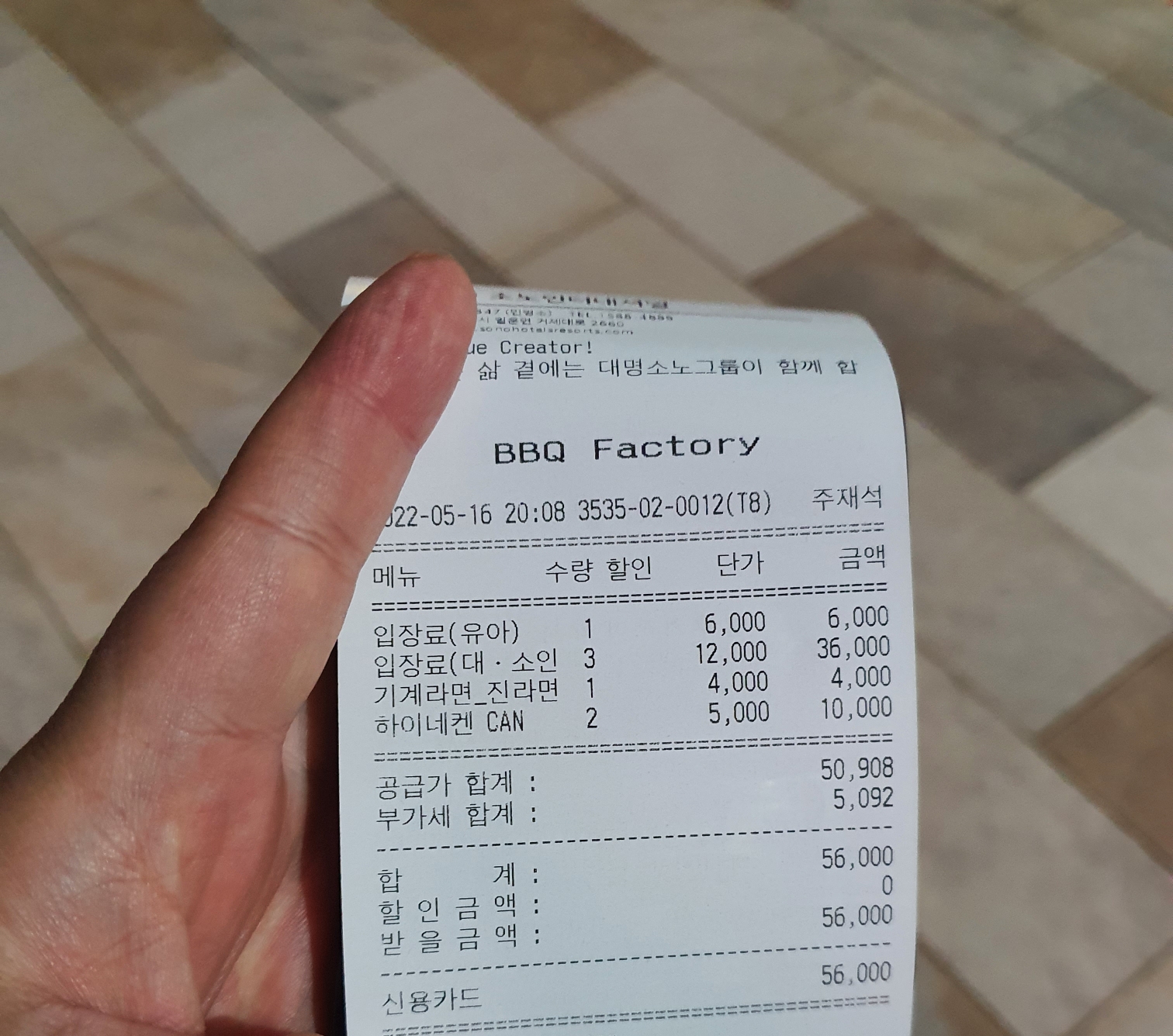 56000원(입장료, 맥주2캔, 라면1개)