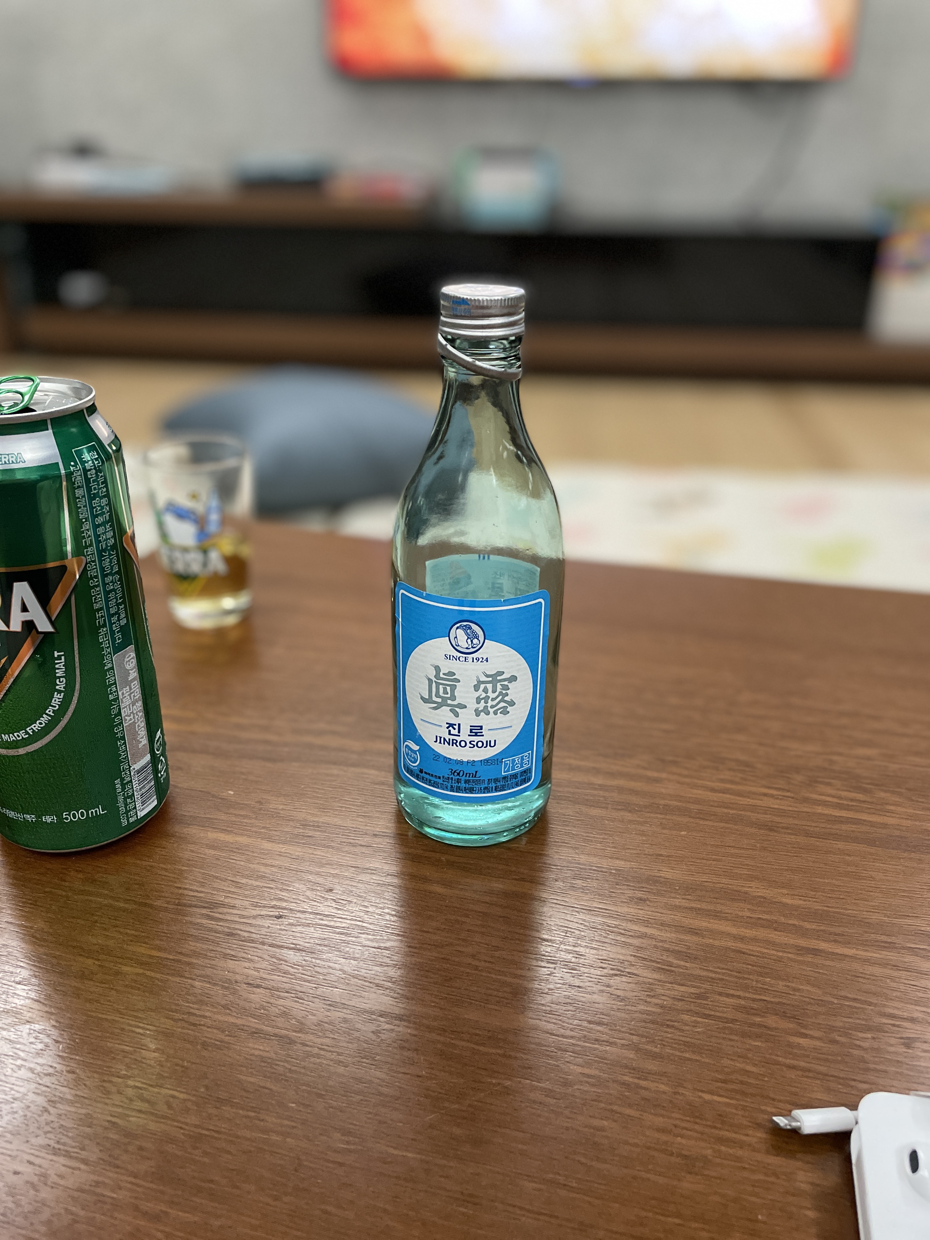 지난번에 샀던 진로 소주 1박스에서 1명을 꺼내서 테라와 함께