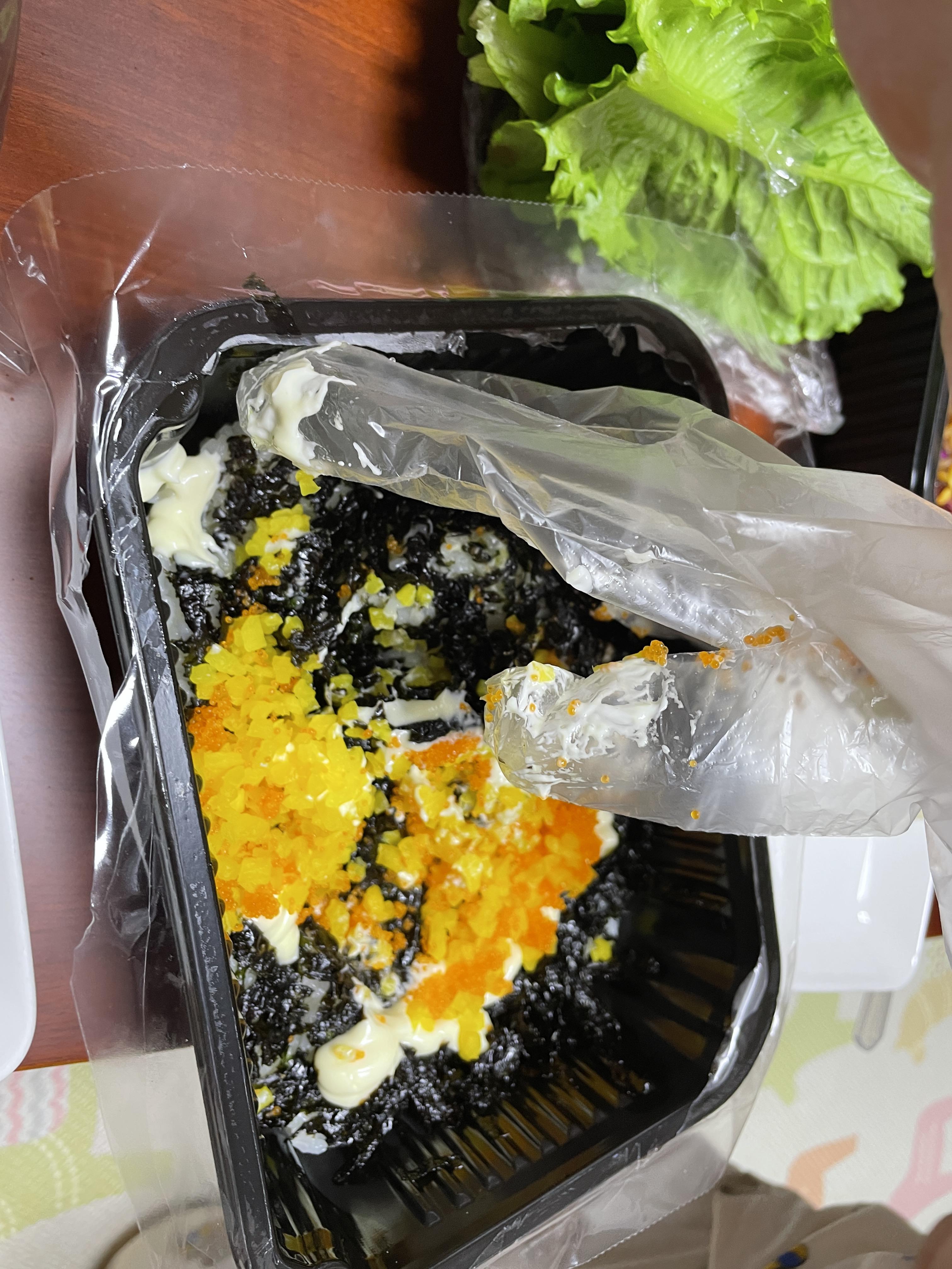 리뷰이벤틀 받을 사이드 메뉴이고, 김가루, 단무지, 날치알 마요네즈가 섞여 져 있습니다.