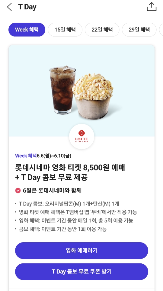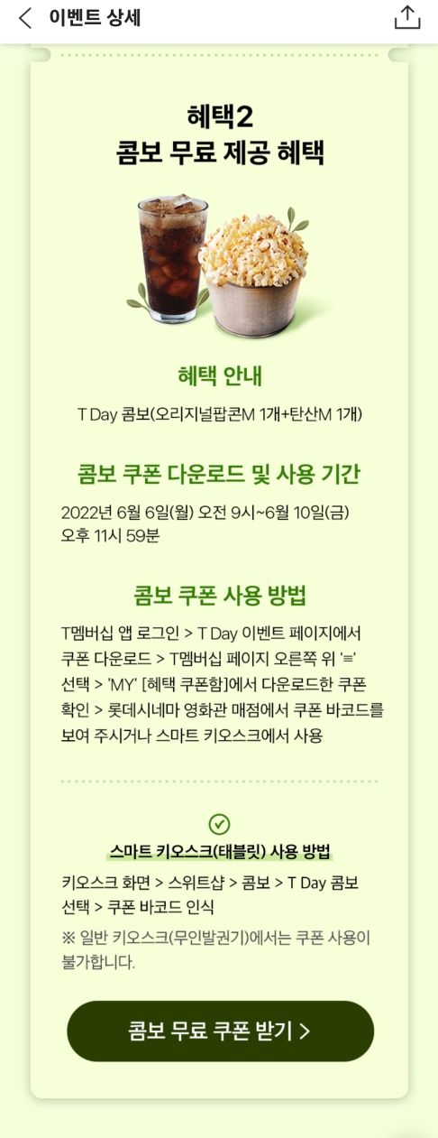 롯데시네마 티데이 콤보 쿠폰을 받을 수 있는