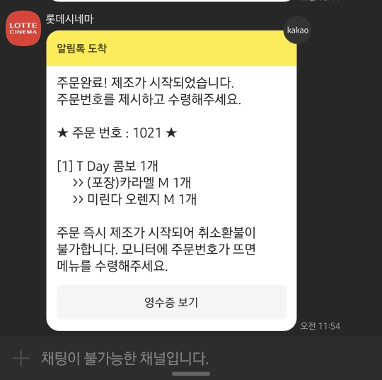 결제가 모두 끝나면 카톡으로 주문번호와 영수증이 발송됩니다.