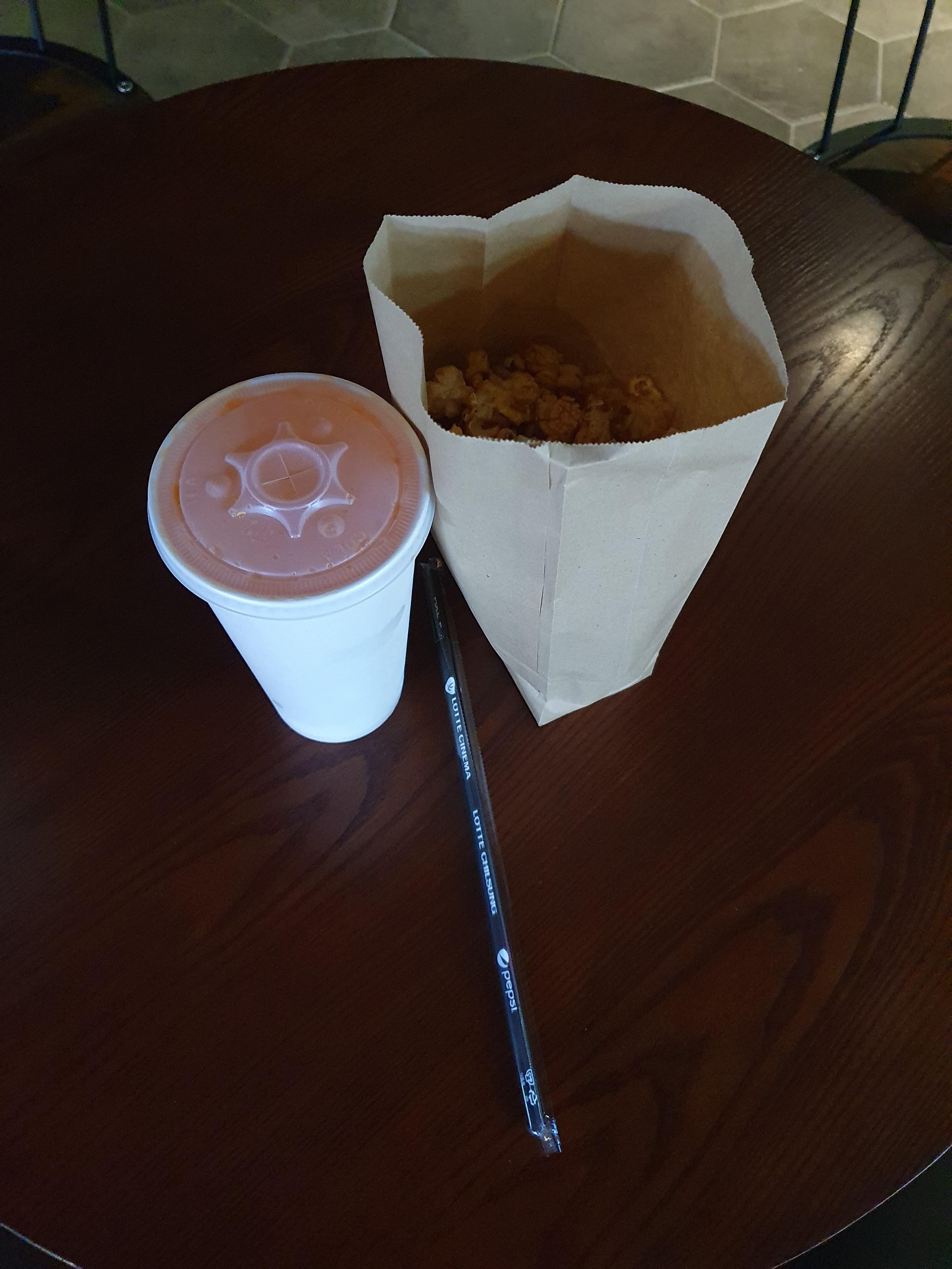저는 미란다 미디엄 사이즈와 카라멜 팝콘 미디엄 사이즈를 시켰거든요 근데 뭔가 포장이 많이 바뀌었어요 친환경적으로 바뀌었습니다 겉에 롯데시네마라는 것도 없어졌고 팝콘도 우리가 알던 팝콘 컵이 아니라 종이 갱지? 재활용 용지? 같은 걸로 바뀌었어요.