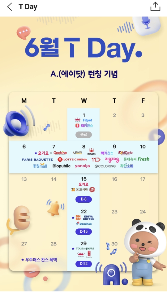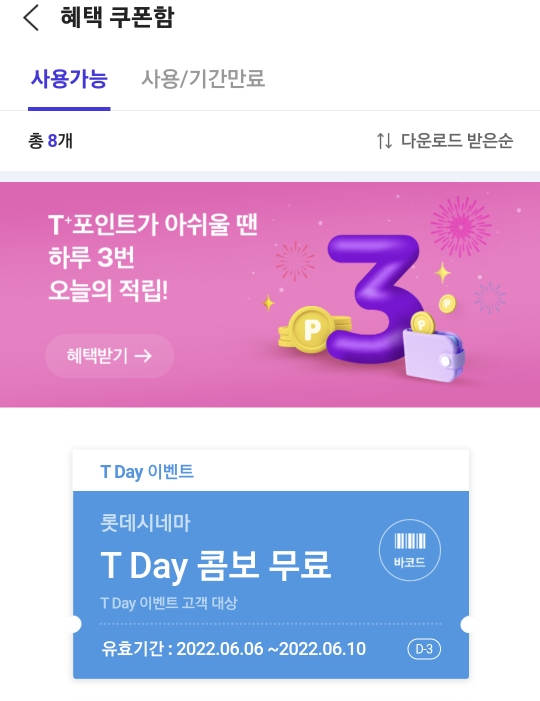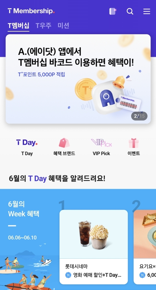 T 멤버십 앱을 켜면 가운데에 보라색 글자로 티데이라고 있습니다. 그것을선택하세요.