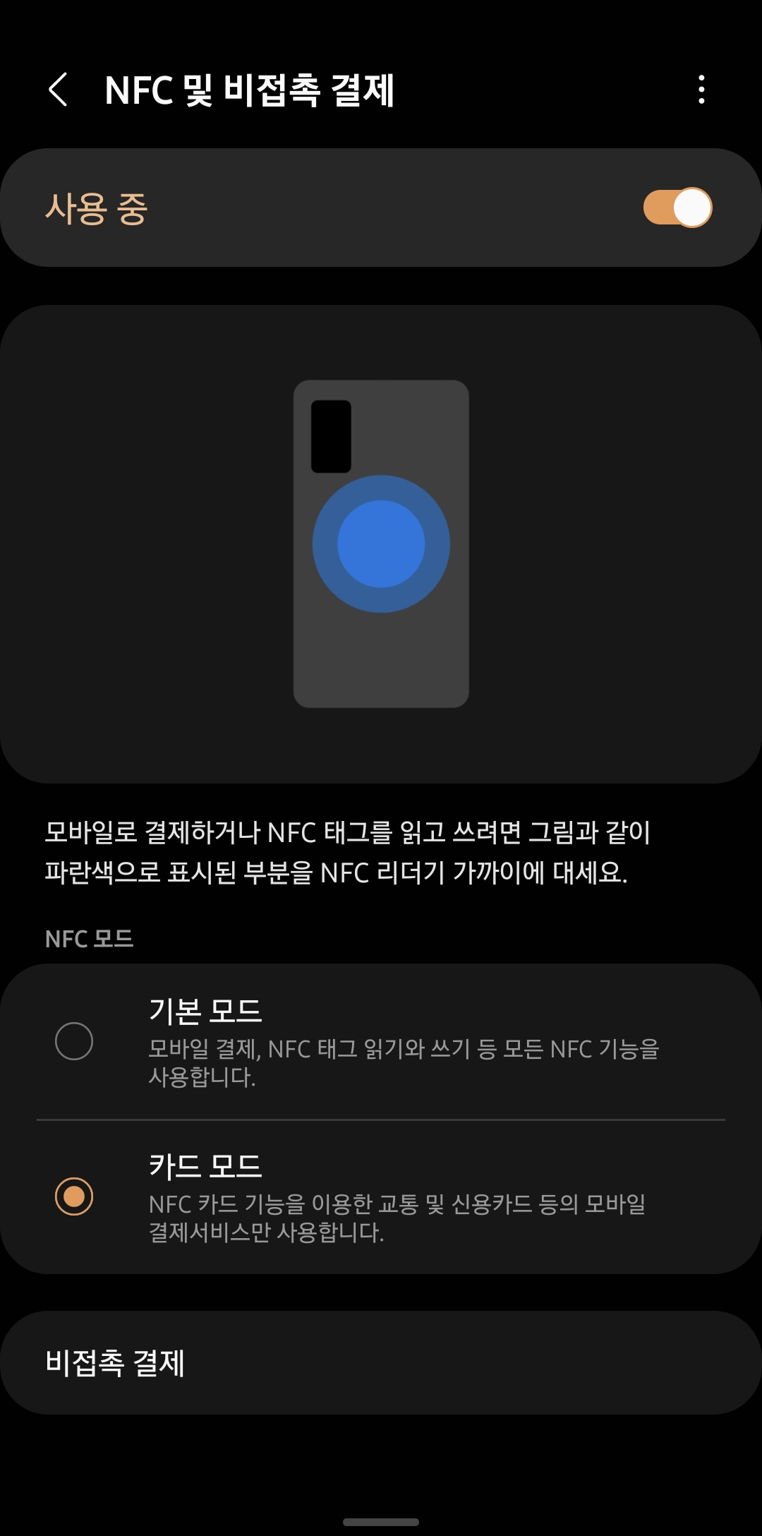 보통은 NFC모드중에서 카드모드로 놓고 사용하시는 게 좋습니다.