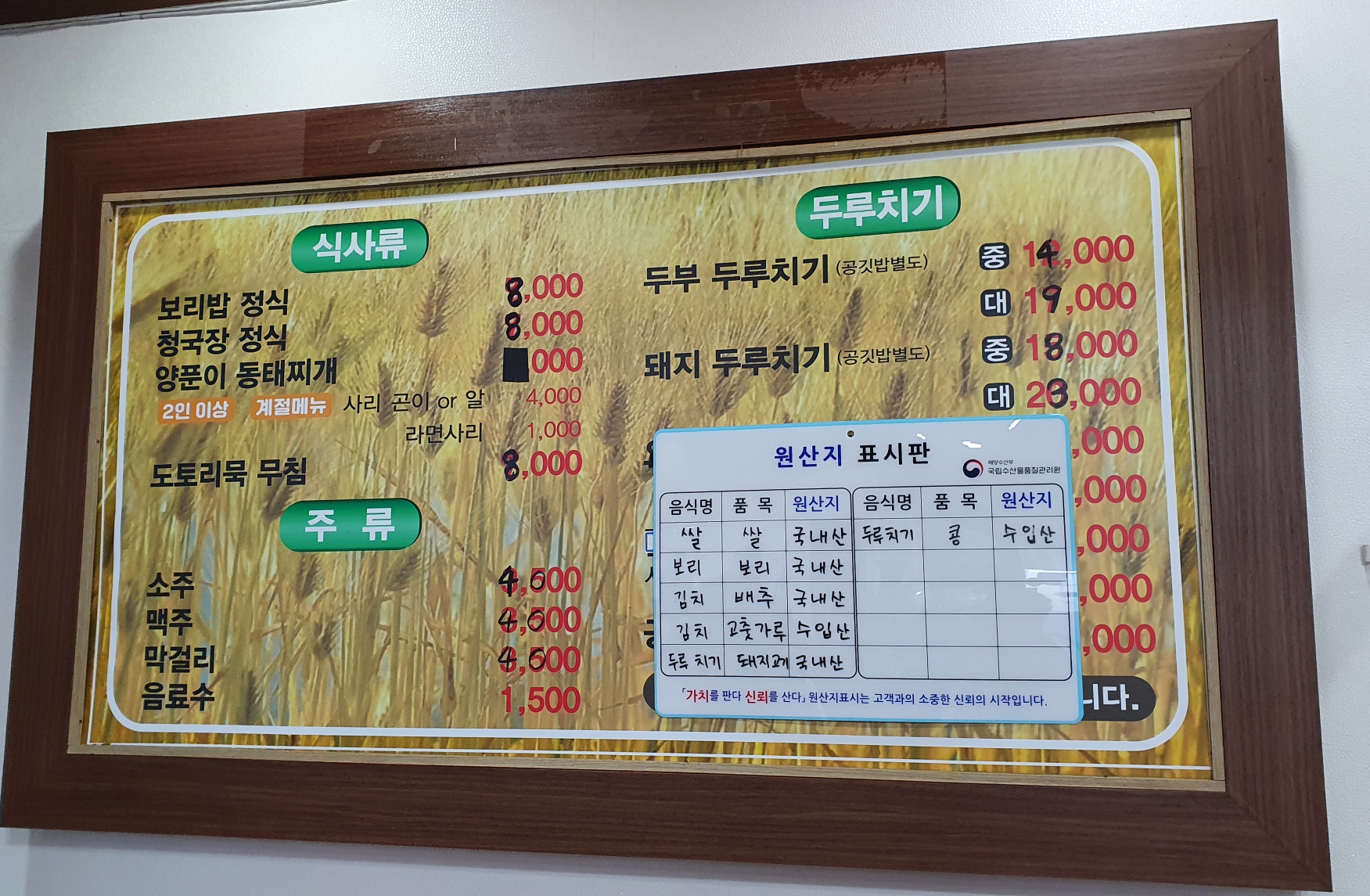 원내동 착한보리밥 집은 아래 메뉴판대로 음식이 나옵니다.