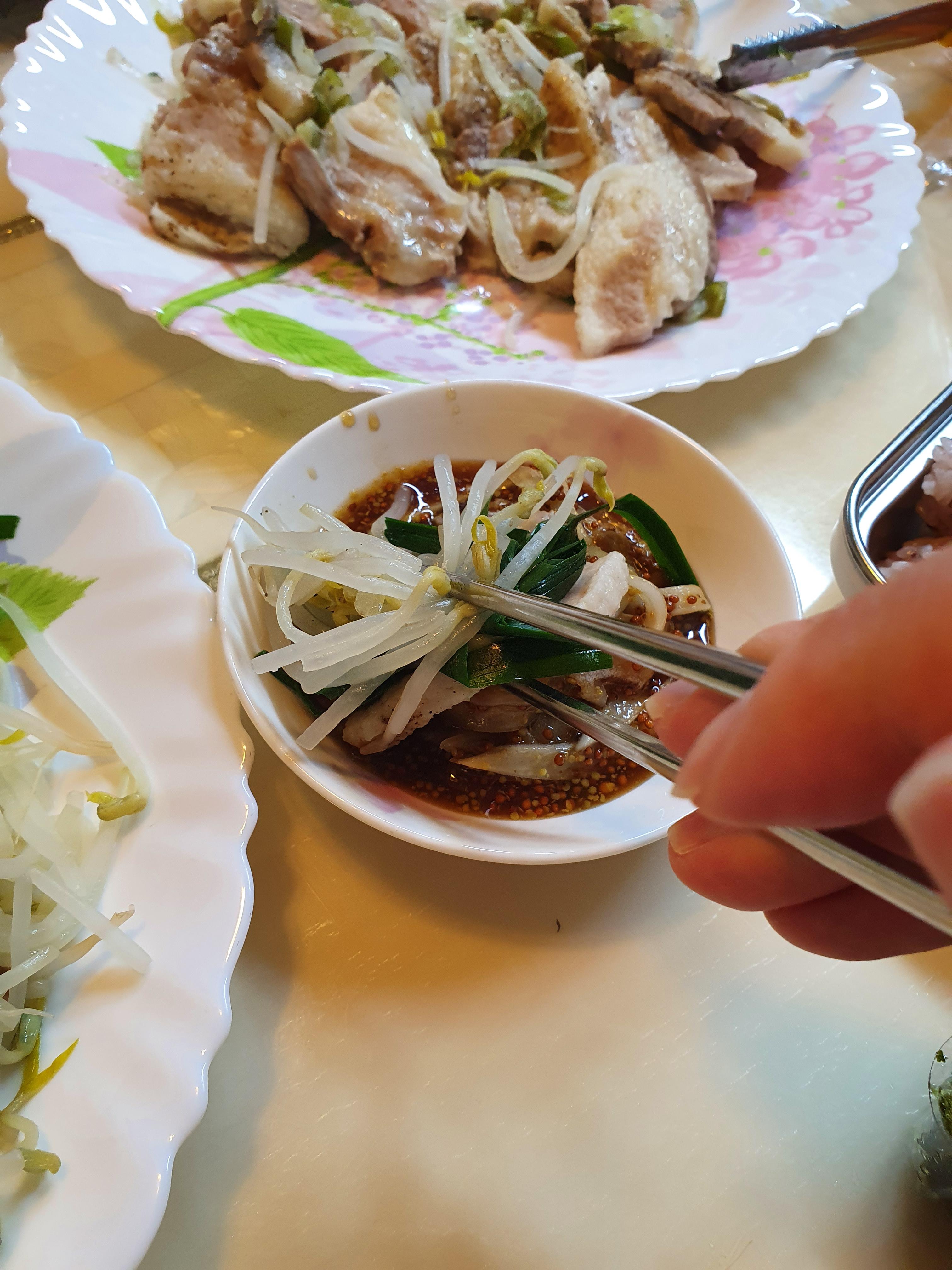 소스에 데친 숙주와 부추 그리고 삼겹살을 소스에 푹~ 찍어서 먹으면~ 와우!!