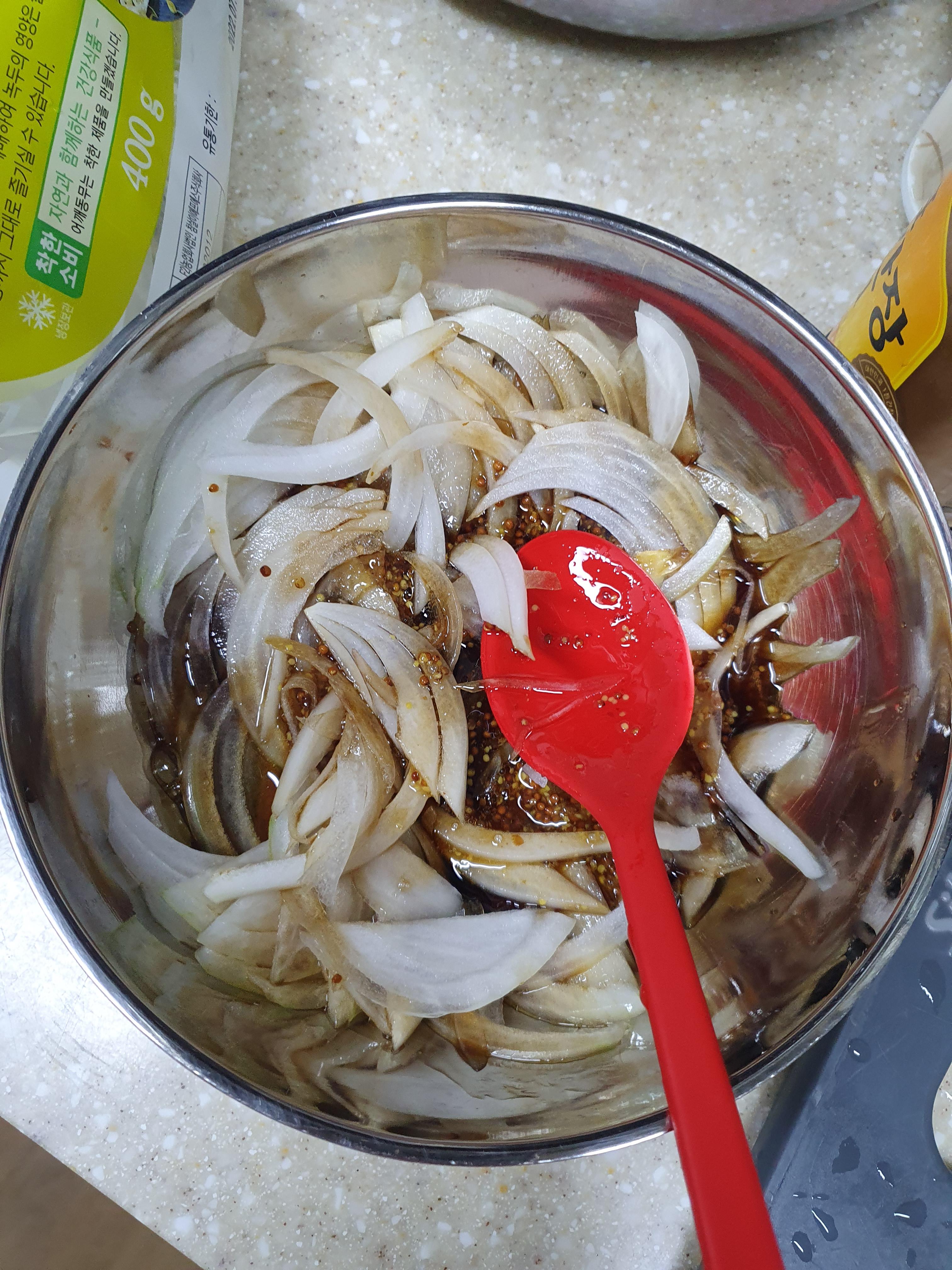홀그래인소스 1수저, 간장 2수저, 식초1수저, 물엿 2수저를 넣은 다음에 섞고 거기에 양파를 아주 얇게 썰어서 섞어줍니다.