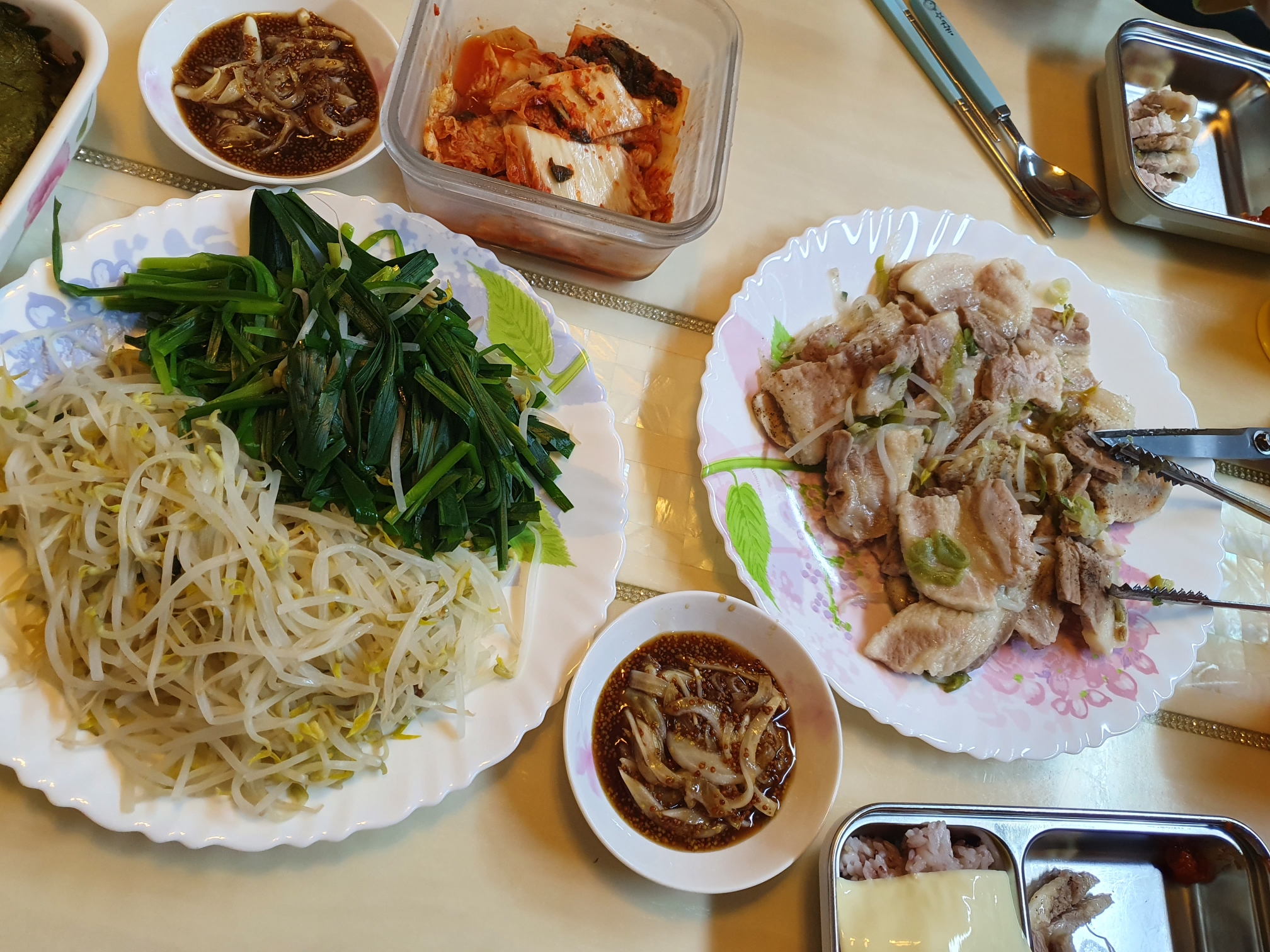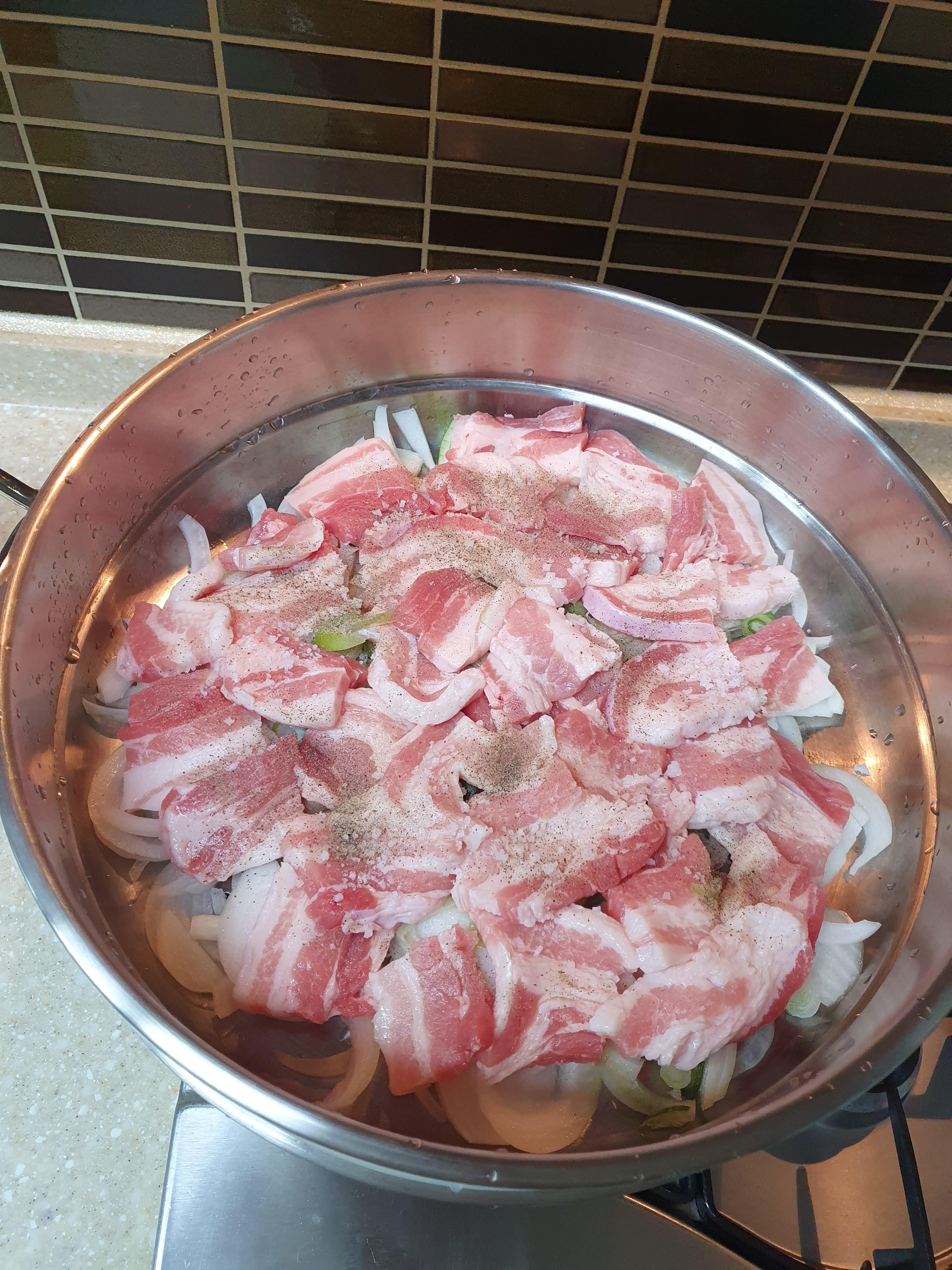 고기는 다 익었는데.. 고기위에 이불로 숙주랑 부추를 넣고 쪄주면 더 감칠맛이 배가 될듯합니다.