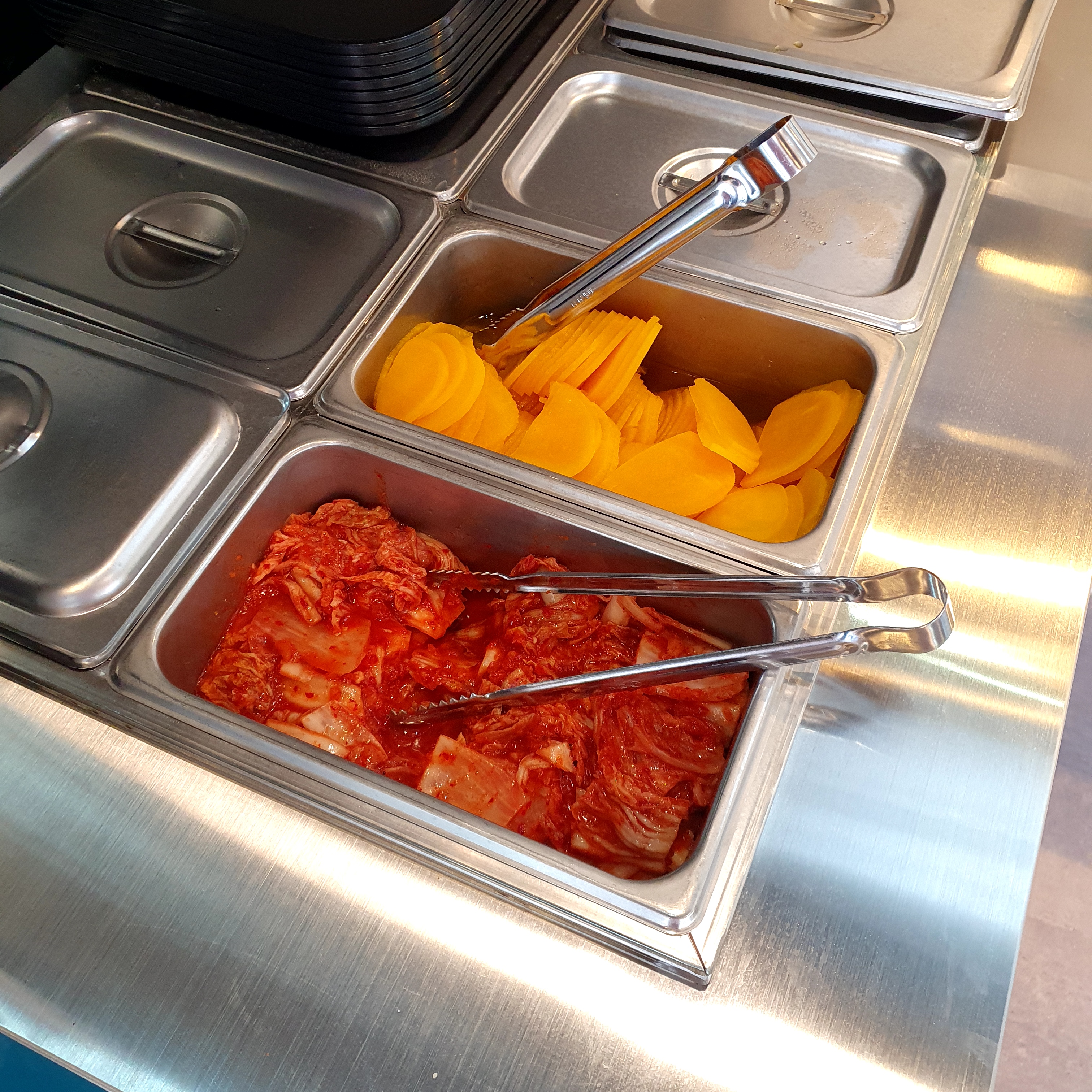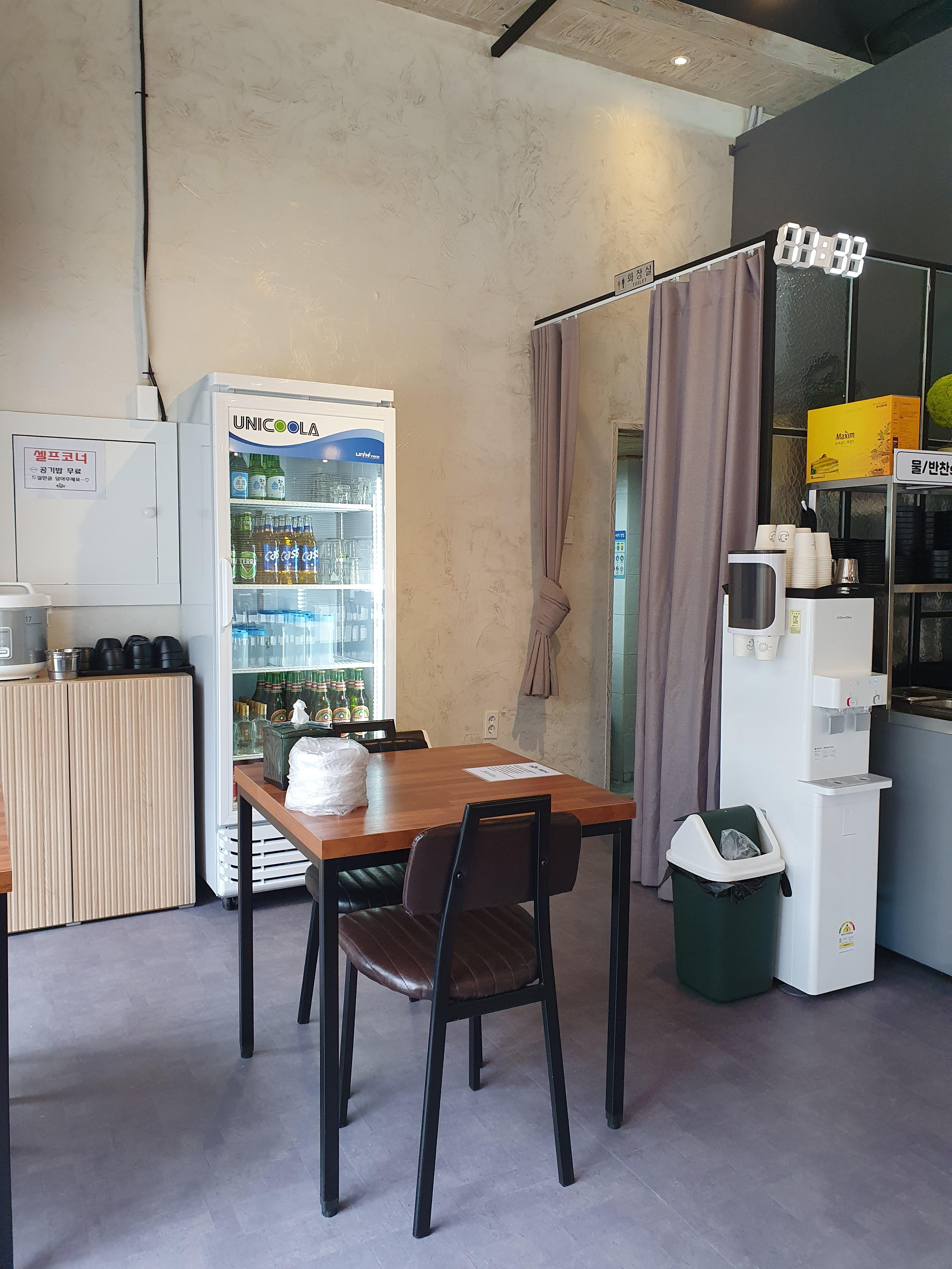주문은 키오스크로 하고, 수저 젓가락, 물, 반찬(배추김치, 단무지) 전부다 직접 가져다 먹어야합니다.