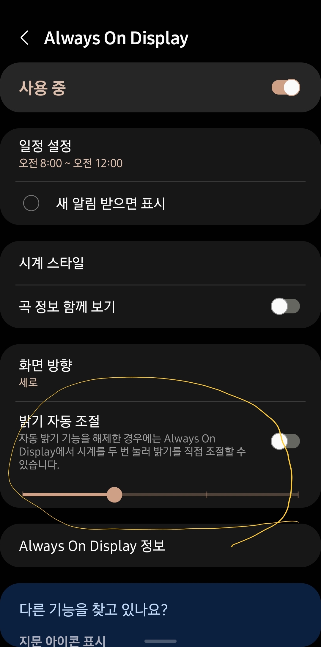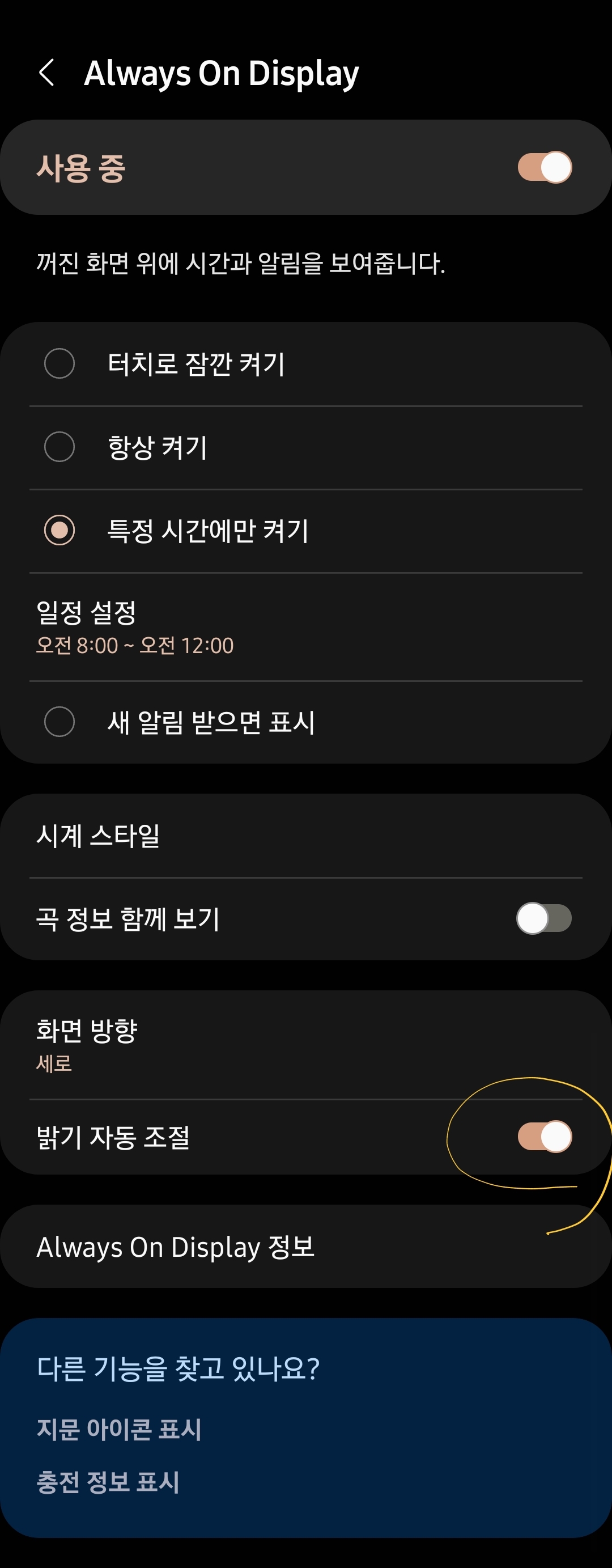 5. 메뉴중 "자동밝기조절" 버튼을 누르면, 스마트폰의 조도 센서로 자동으로 aod 밝기를 조절이 가능합니다.