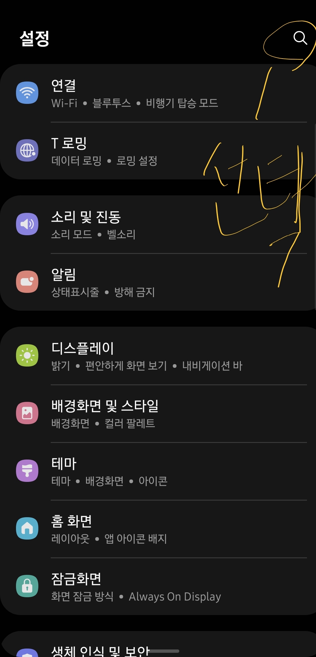 : 설정 상단의 돋보기를 선택합니다.