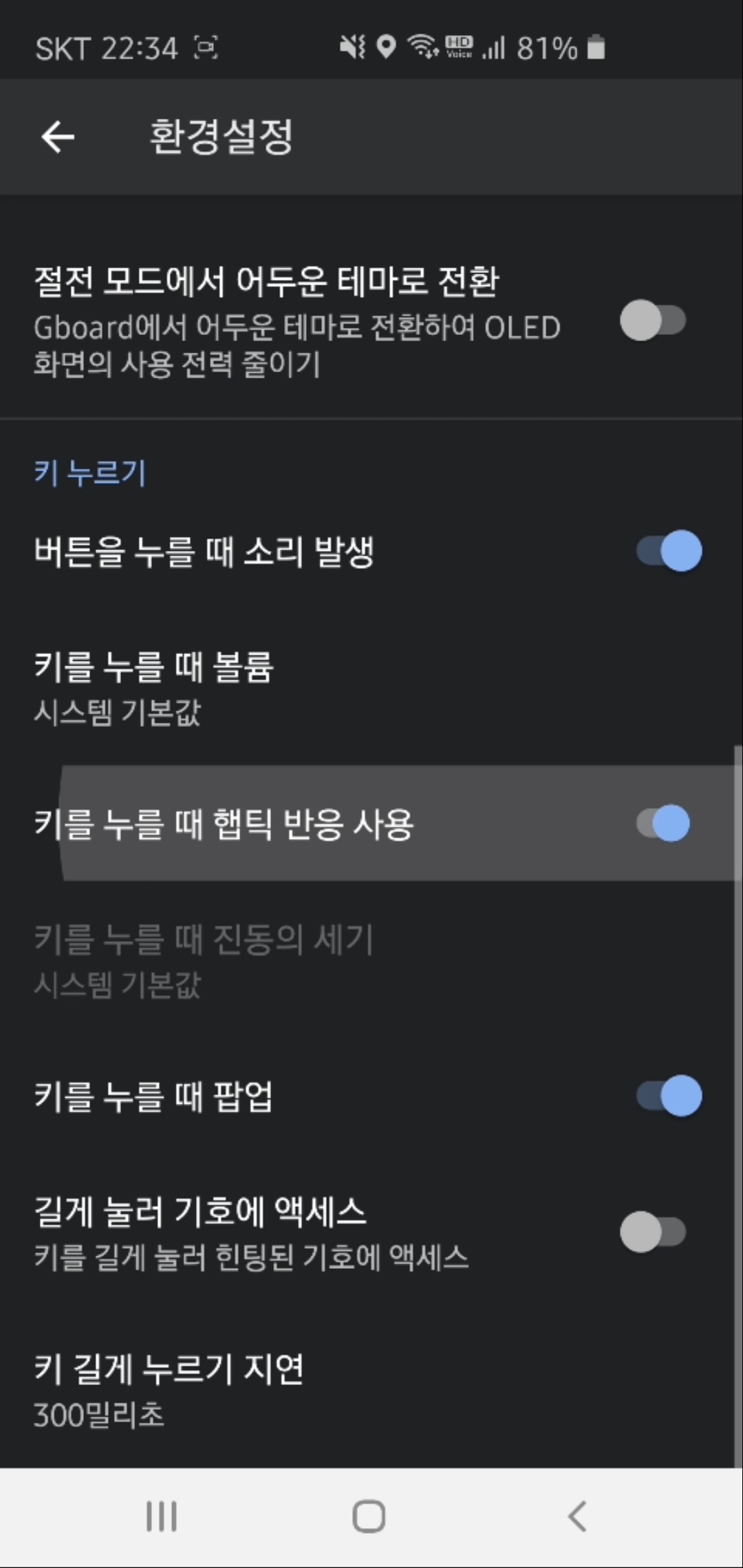*(카톡 문자 여튼 구글 키보드가 나온상태에서는 햅틱기능이 활성화 됨.)
