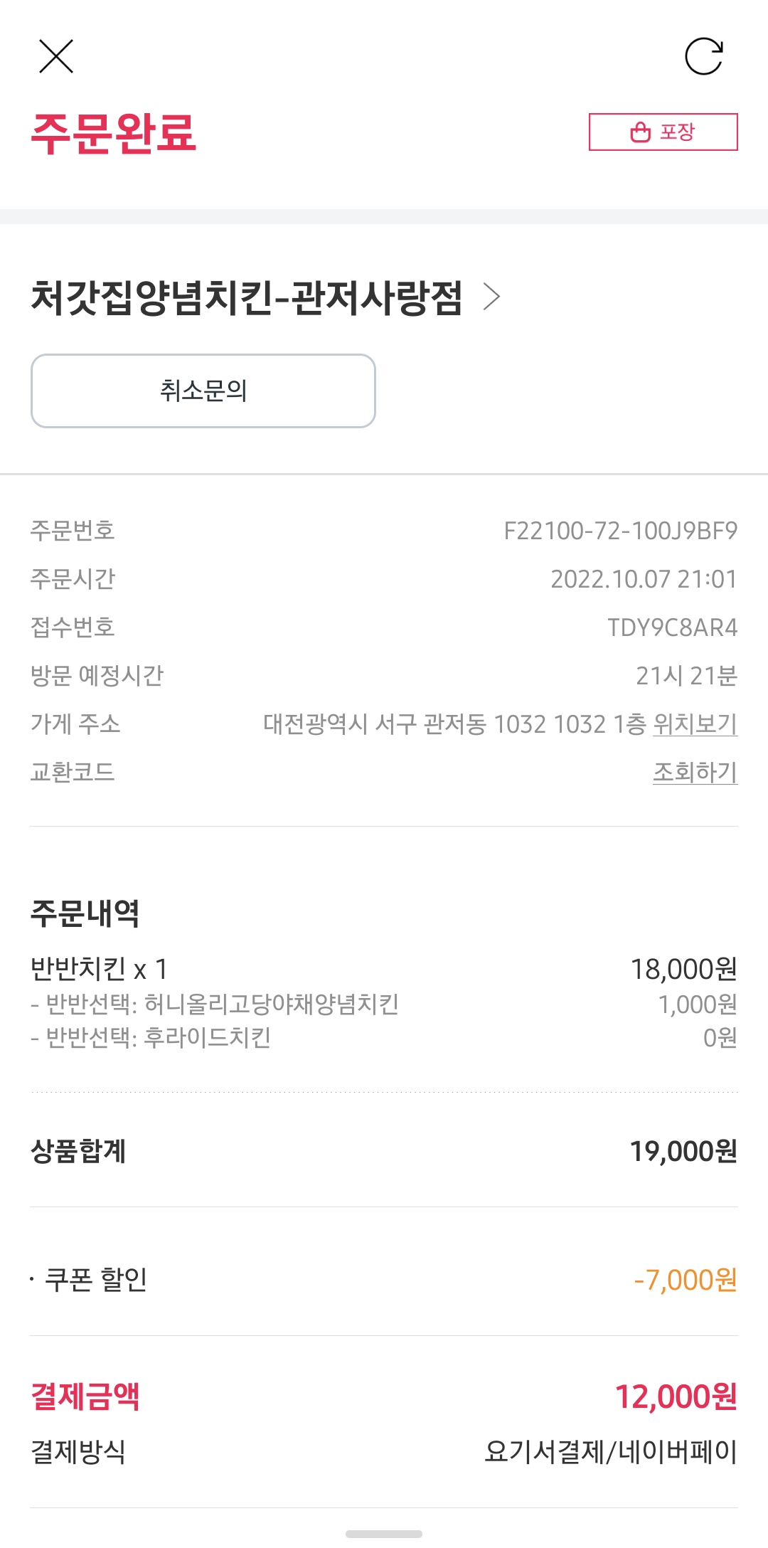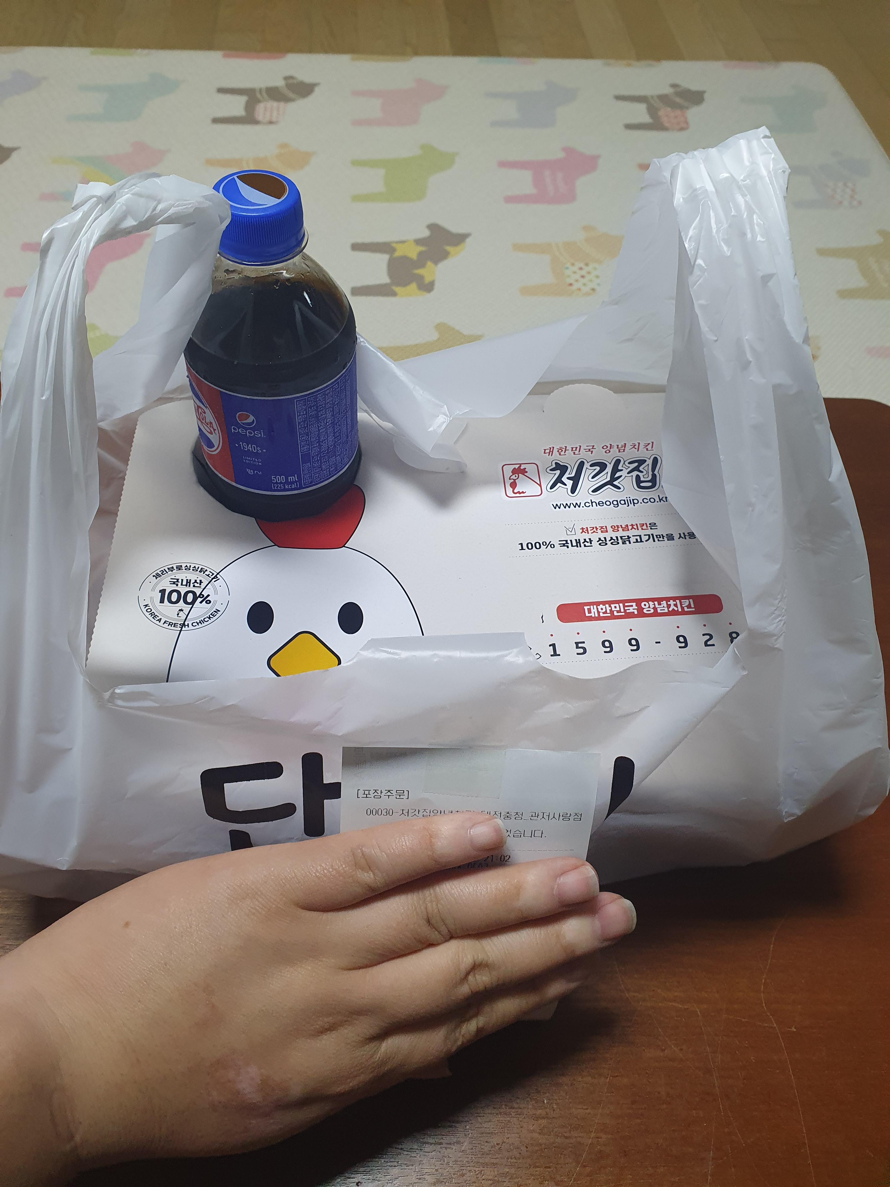 그리고 이 쿠폰을 요기요에 등록을하고, 포장으로 처갓집 양념통닭을 시켜 먹었죠 ㅎㅎ