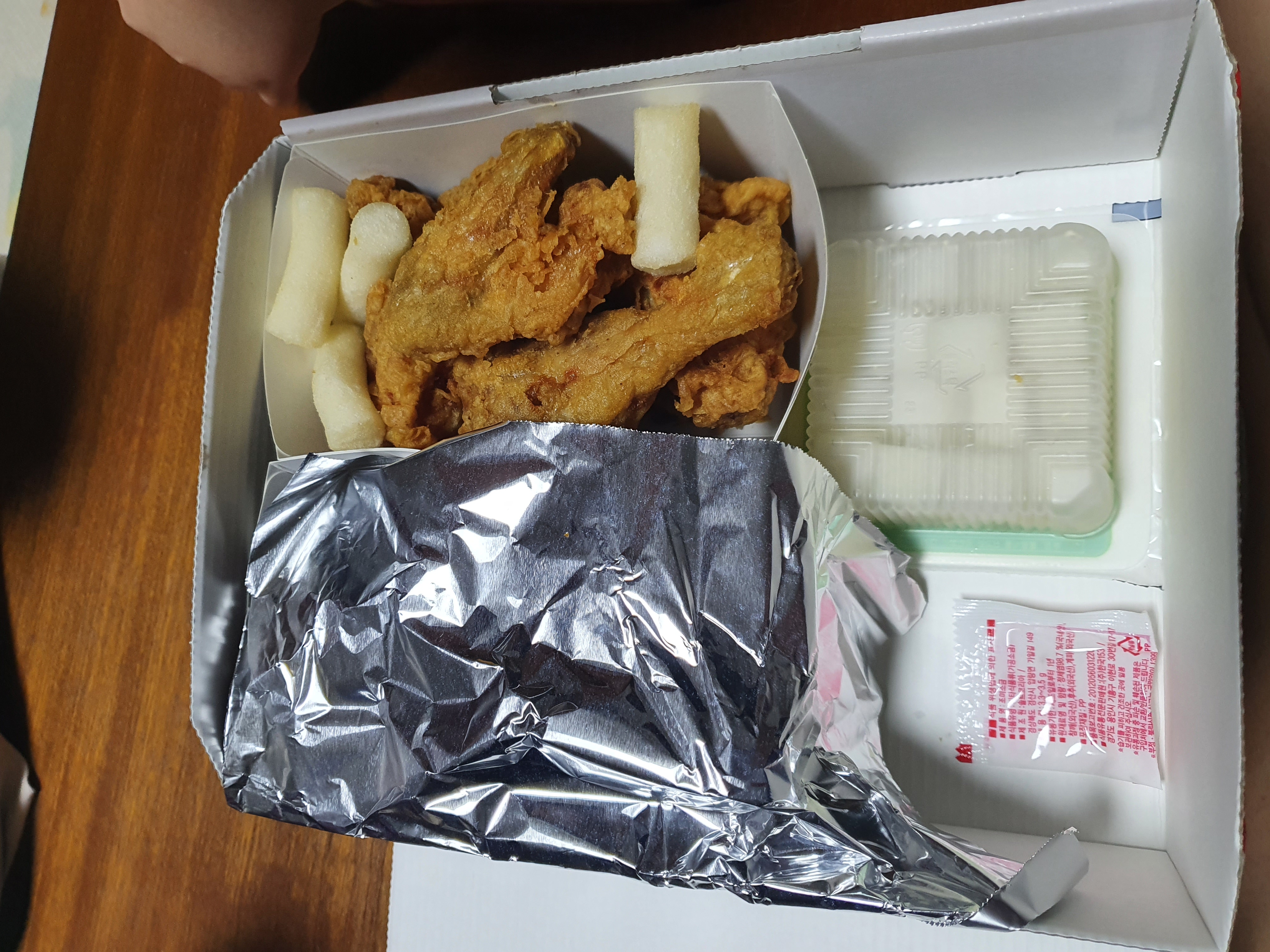 치킨은 1마리를 반반 포장하였고, 양념은 열기가 나가지 않게 이렇게 호일로 감싸져 있습니다.