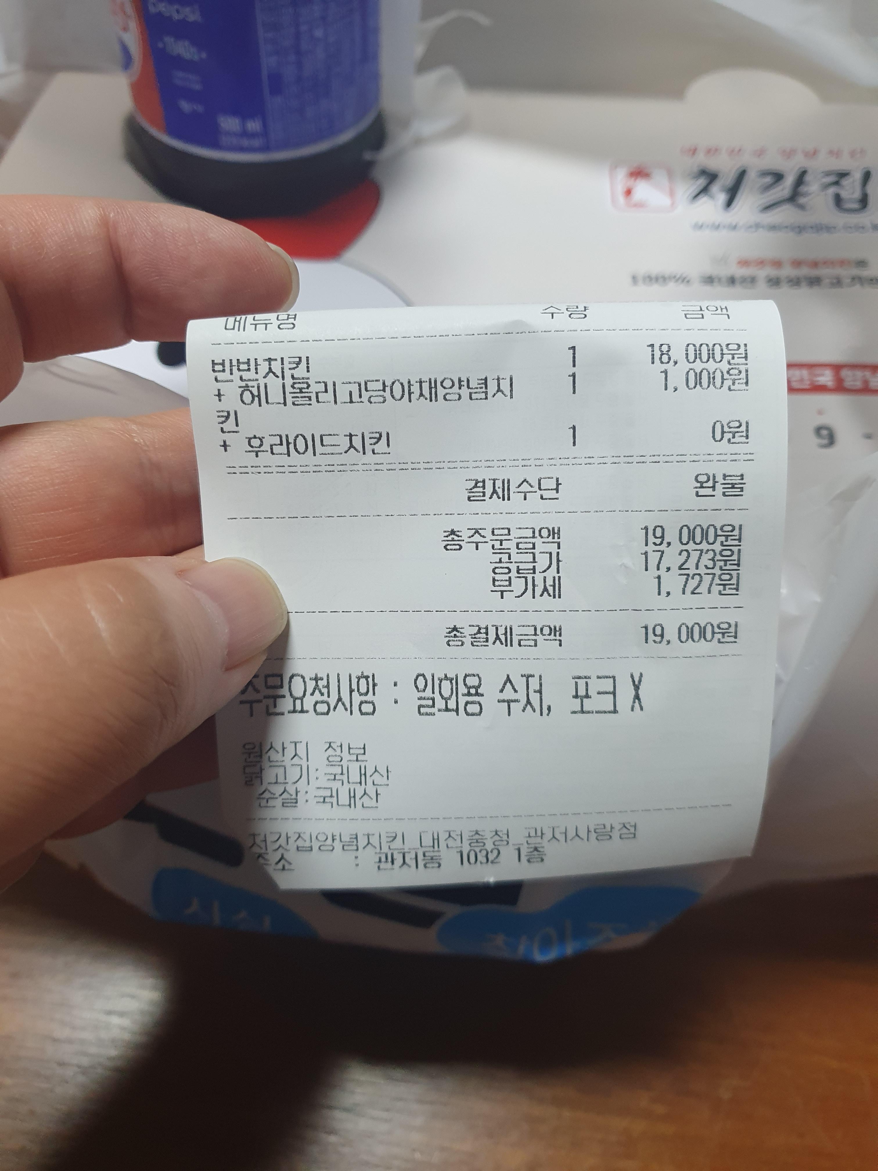 지난번에 대전 관저동에 있는 처갓집 양념통닭에서 반반통닭(후라이드반, 양념반) 시켜먹고 이제야 포스팅을하네요..
