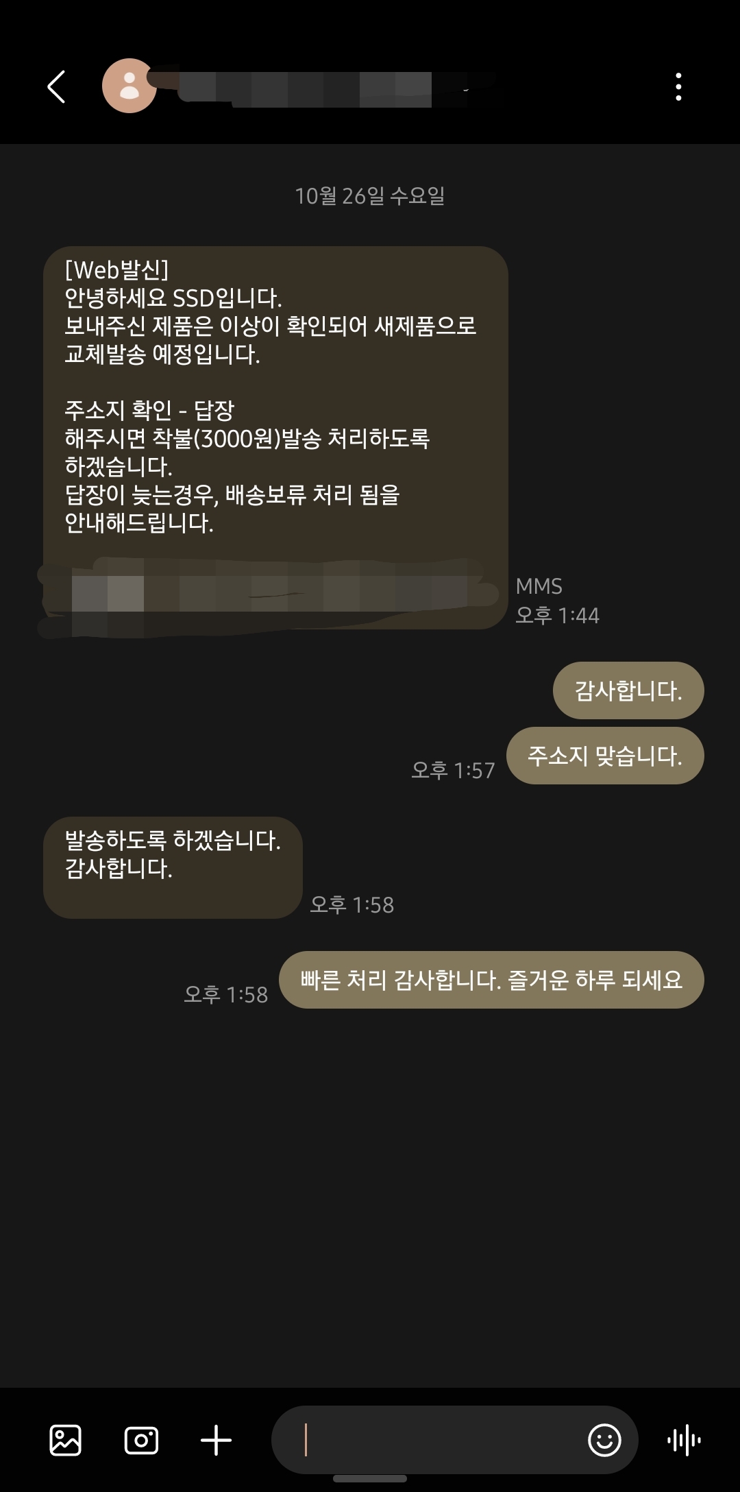 문제점이 발견되어서, 새로 SSD를 보내준다는 문자를 받았습니다.