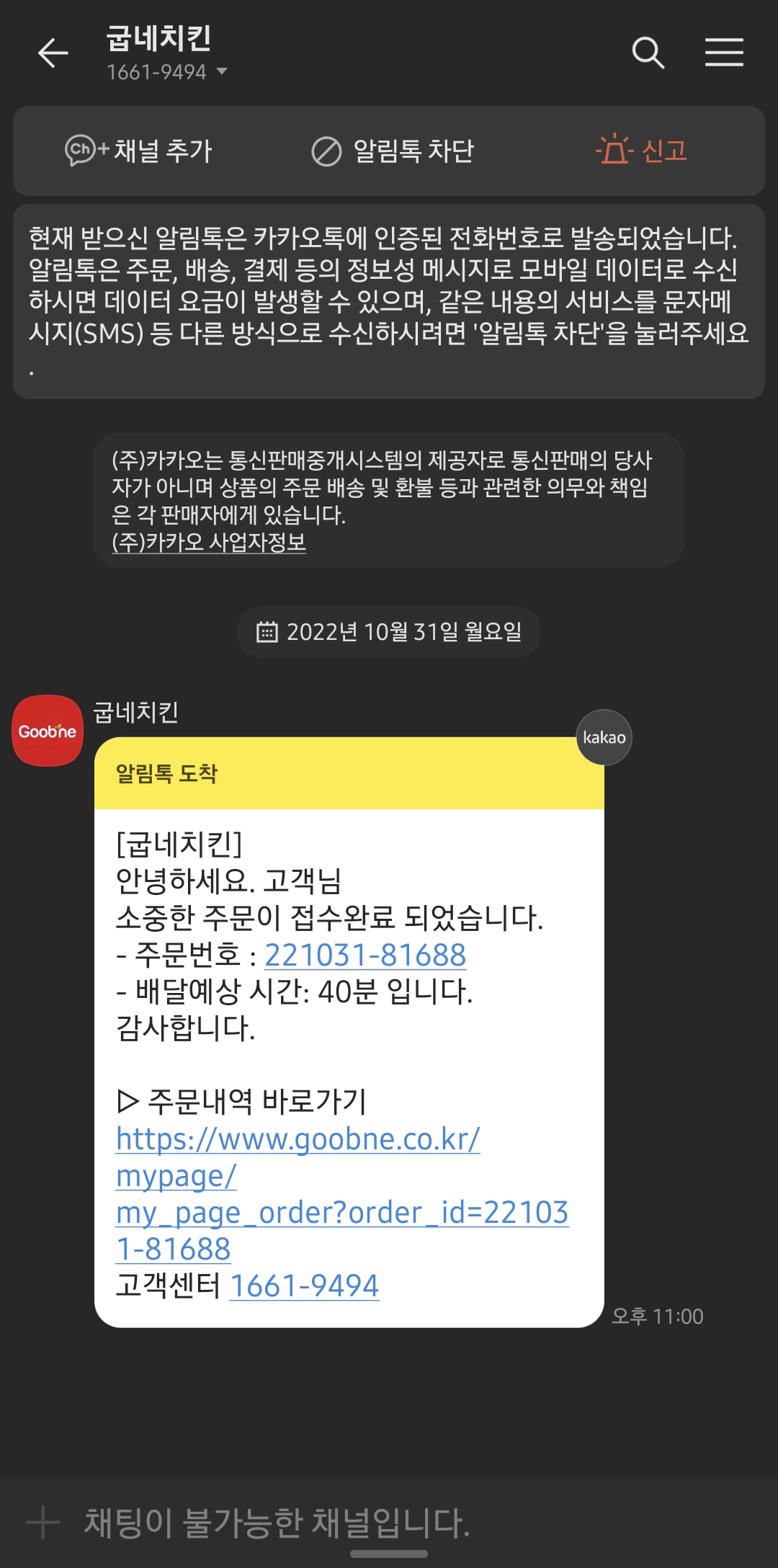 그리고 카톡으로 배달 주문접수하였다고 카톡 문자가 옵니다.
