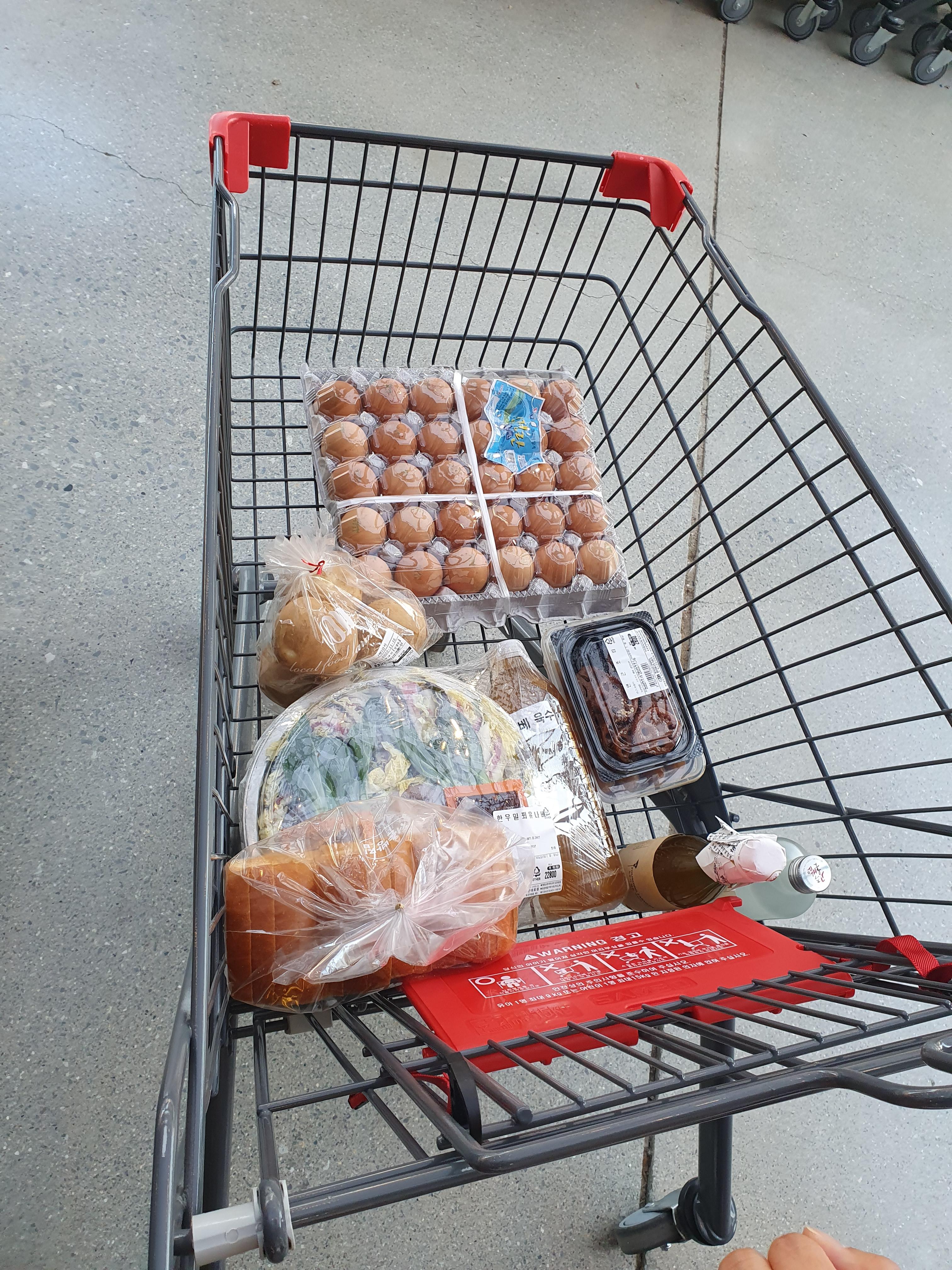 그냥 처음 방문해 봤으니, 반찬 2가지, 계란1판, 감자, 밀퓌유 나베 밀키트, 참기름 1병, 생율소주1병 이렇게 구매를 하였네요.