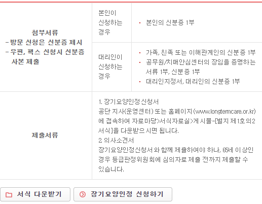 - 자격 : 장기요양보험가입자 및 그 피부양자, 의료급여수급권자