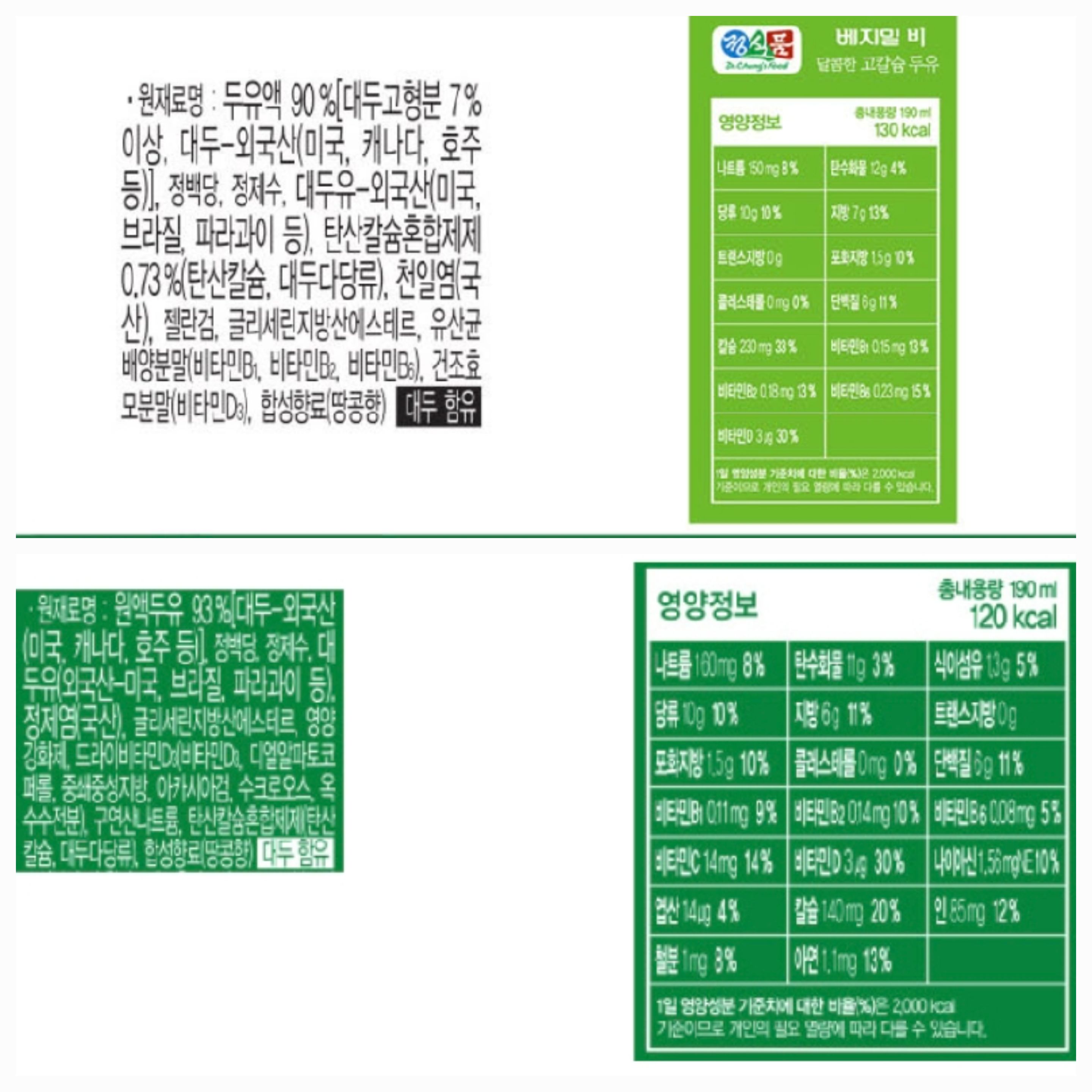 | 구분 | 일반 베지밀B | 고칼슘 베지밀B | 원산지 |
