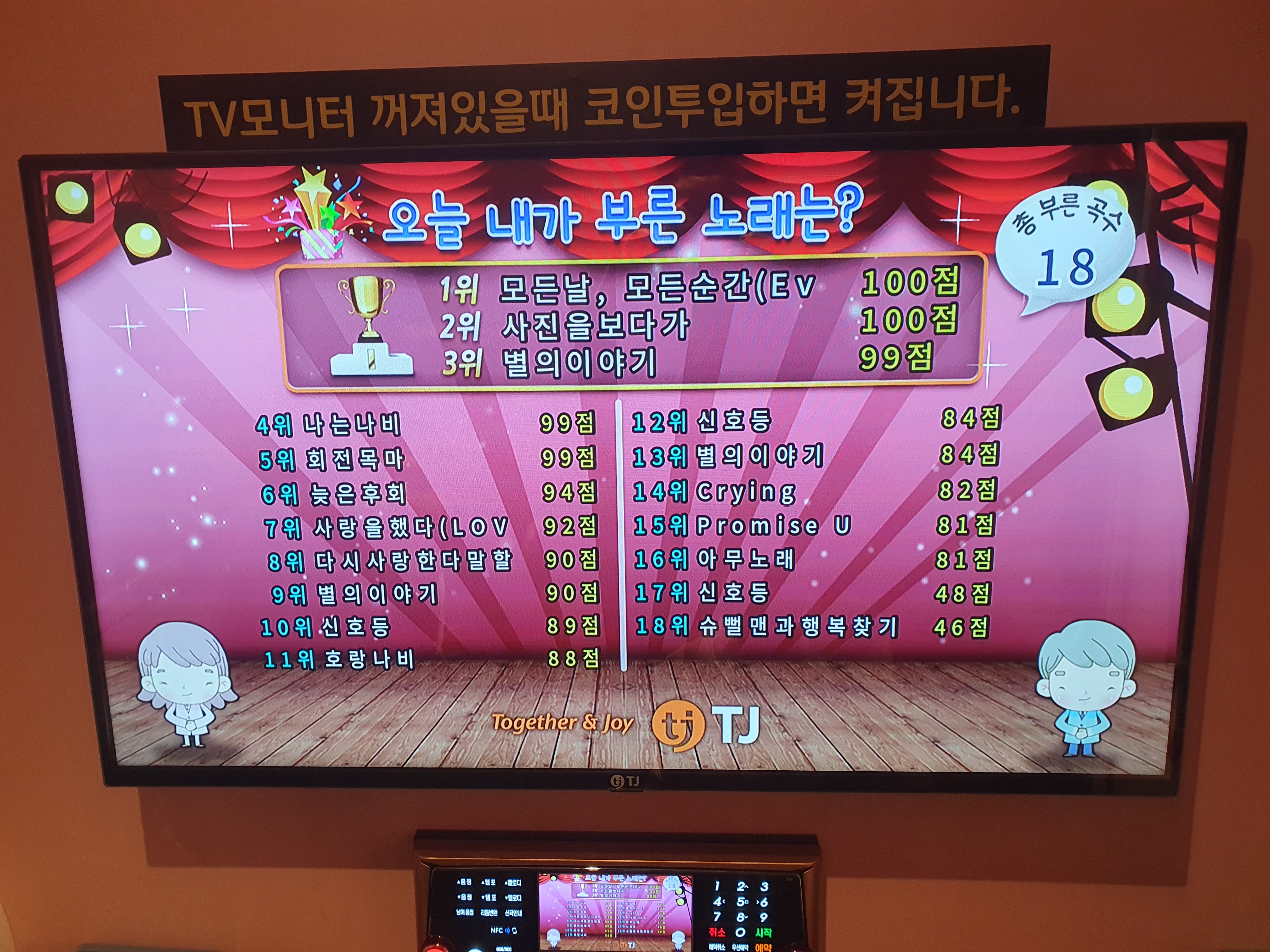 오늘 1시간 동안 관저동 코인노래방에서 노래를 18곡이나 불렀네요.