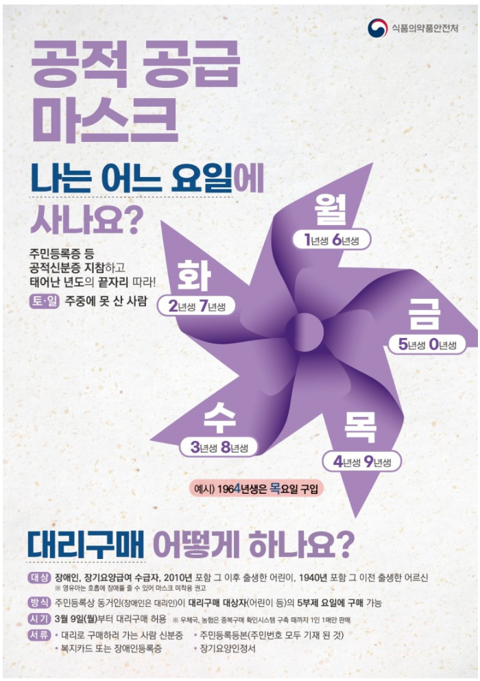 *대리 구매시 대리인의 생년 마지막 숫자로 구매일이 정해지는게 아니고, 실제 마스크를 갖게되는 장애인이나 만10세 이하 및 80세이상의 대상자의 생년 마지막 숫자로 구매요일이 정해지는겁니다.