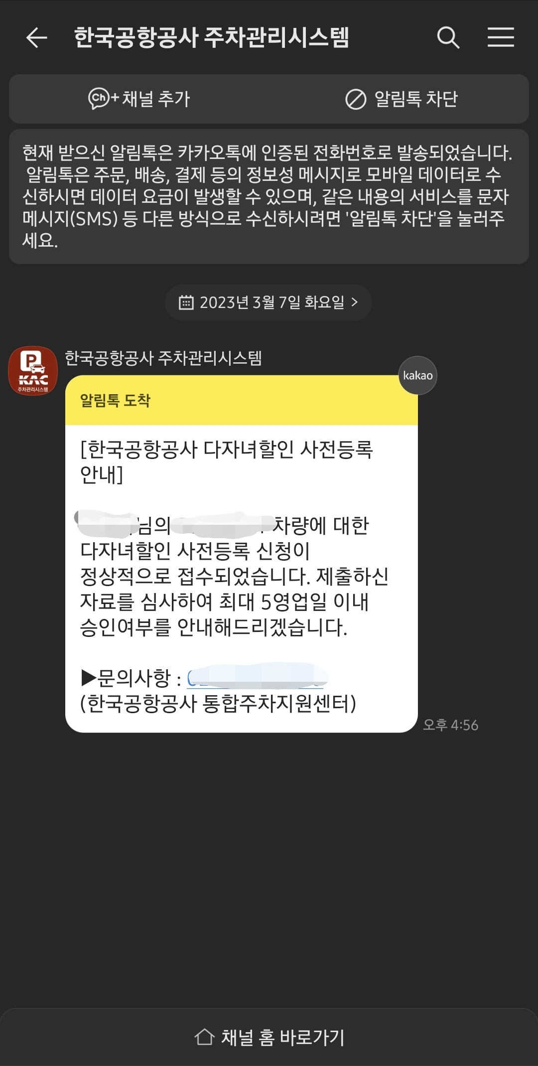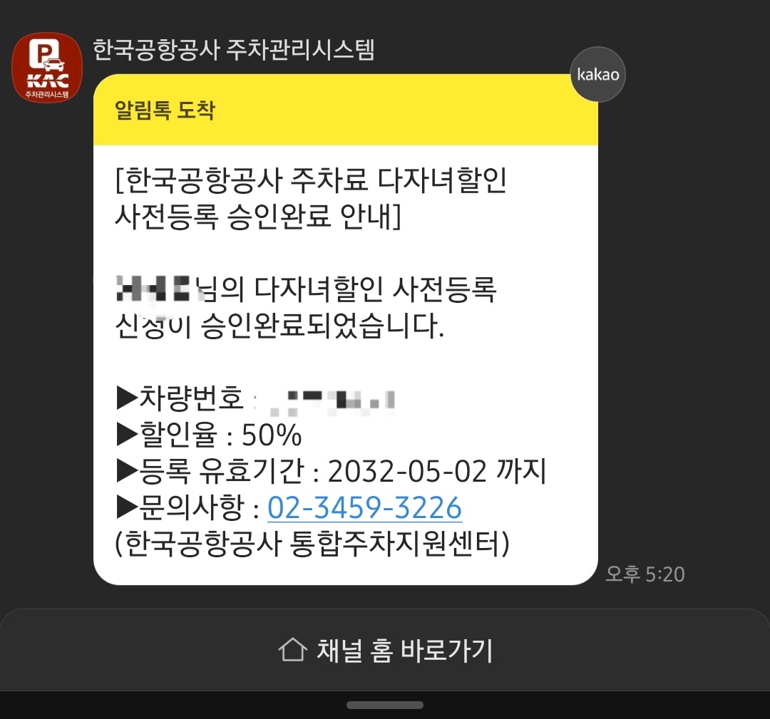다자녀 할인 신청 완료 카톡이 청주 공항 카톡으로 왔습니다.
