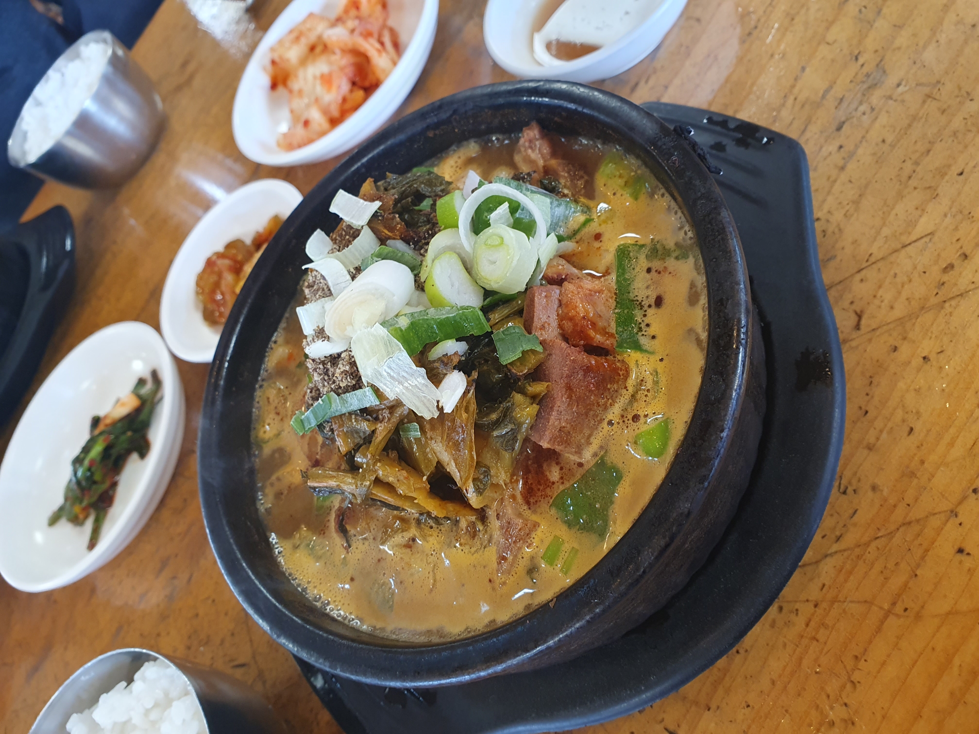 보글보글 끓고 있는 뼈 해장국가 공기밥이 나왔습니다.