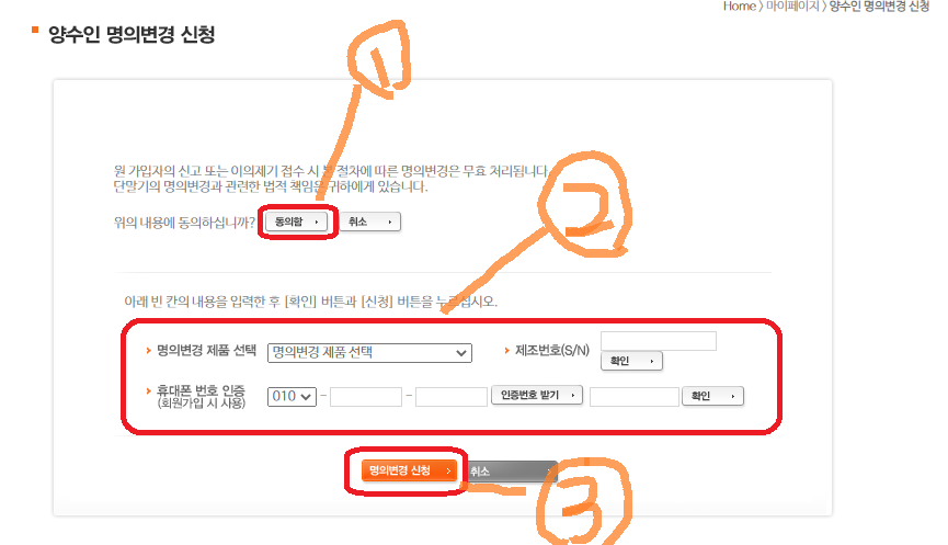 7. 그럼 "양수인 면의변경 신청" 창이 뜨고, 맨위 동의함 선택, 제품선택, 제조번호 넣고, 휴대폰 인증번호 받고, 인증번호 입력한후 확인 누르고, "명의변경 신청"을 누르면, 제품등록이 완료됩니다.