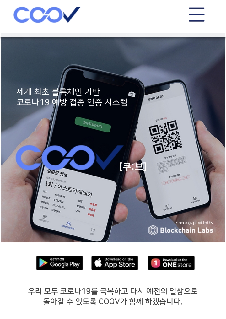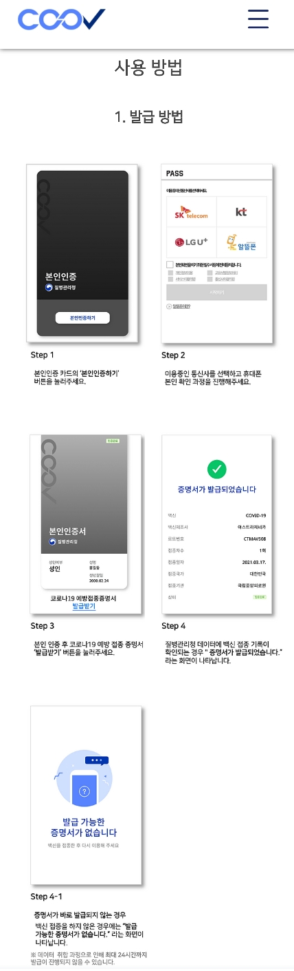 코로나19 예방접종 증명서는 스마트폰에서 COOV 어플을 통해 증명하세요.