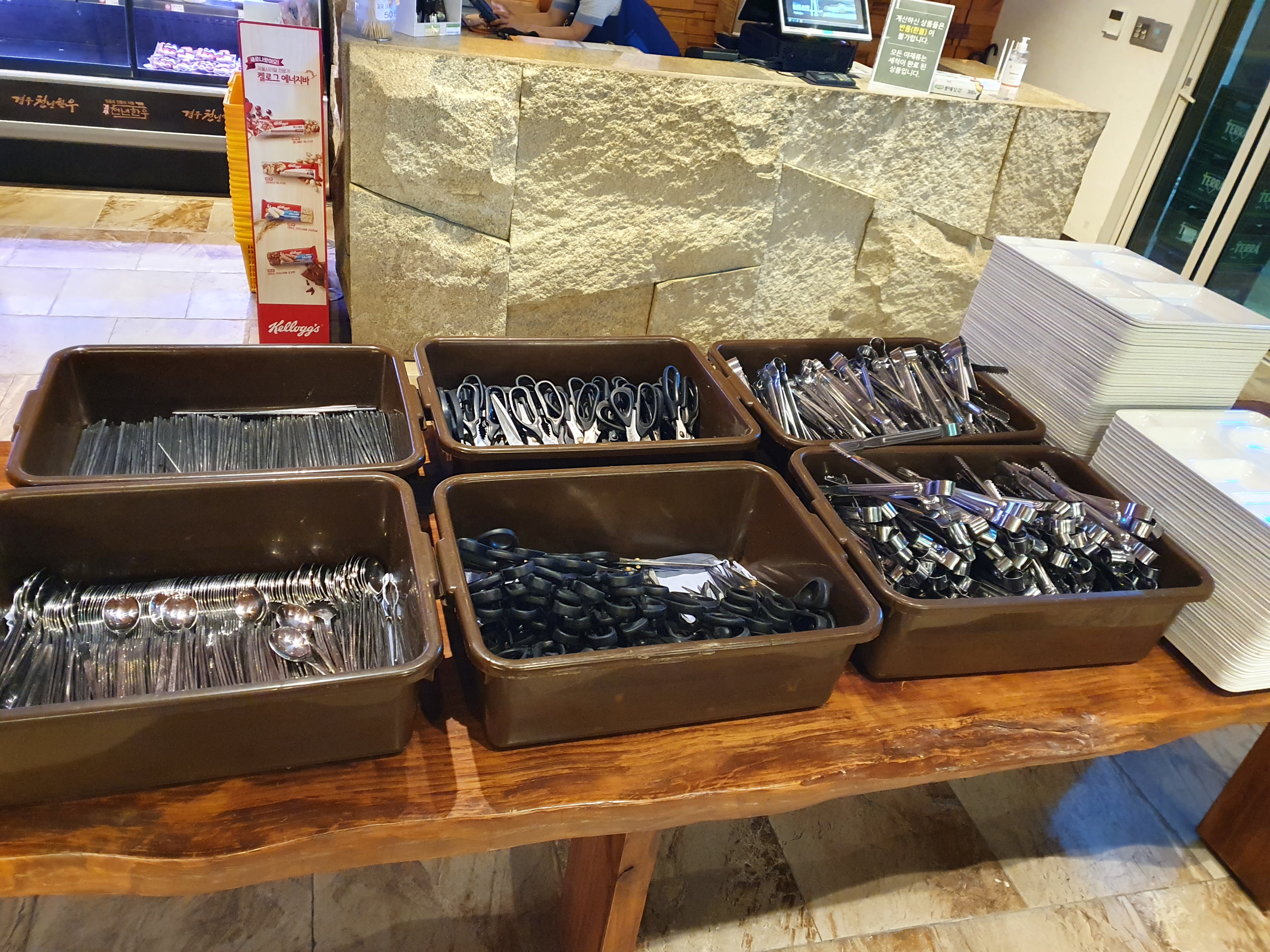 초벌구이 하는곳 바로 옆에 접시랑 집게 가위, 소금이 전부다 세팅이 되어 있습니다.