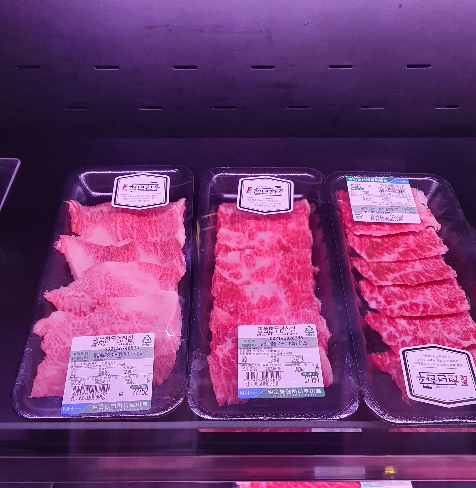 여기에 진열된 제품은 일운농협에서 나온 것 같습니다 저는 소고기가 비싸서 먹지 못했는데